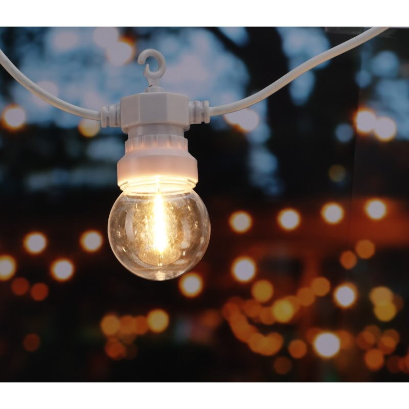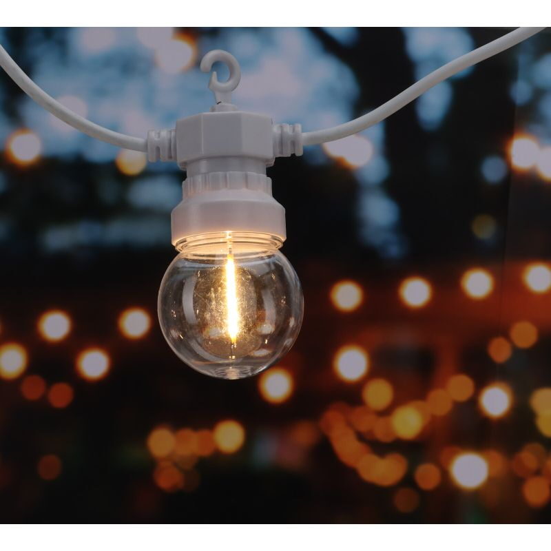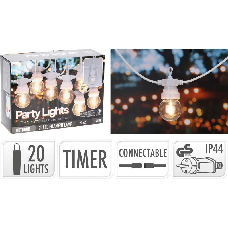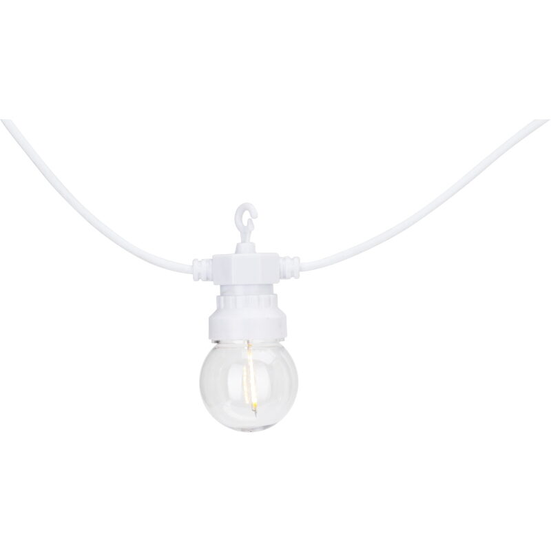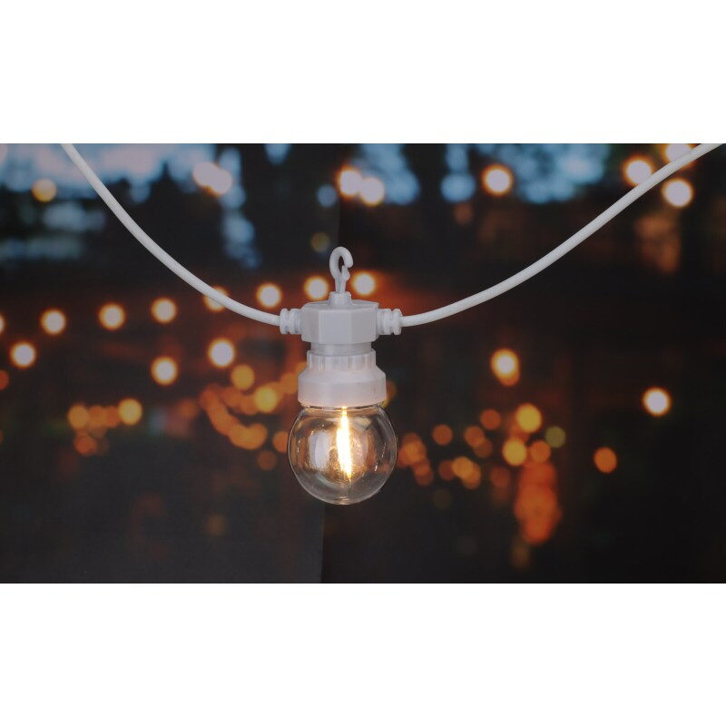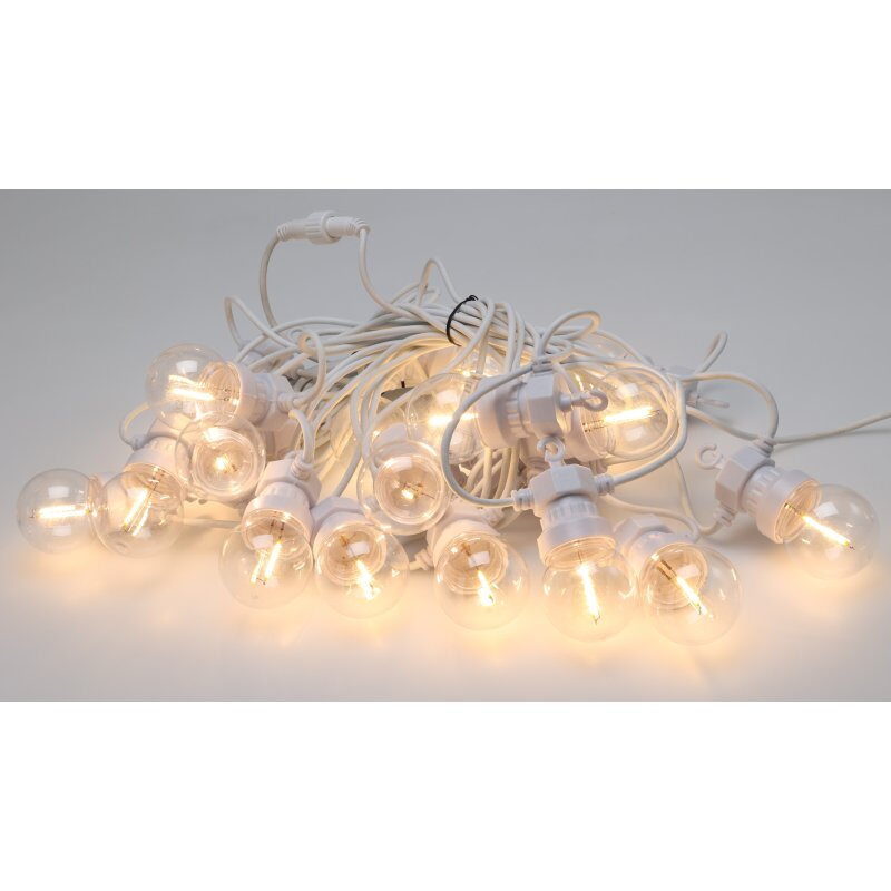 Elegantní světelný řetěz s 20 koulemi G50 vyzařujícími příjemné teplé bílé světlo. Každá koule obsahuje jedno LED vlákno, které vytváří jemný a rovnoměrný světelný efekt. Řetěz je připojitelný, vybavený časovačem a bezpečným transformátorem s ochranou IP44. Díky bílému kabelu a decentnímu designu se skvěle hodí pro vnitřní i venkovní dekorace.