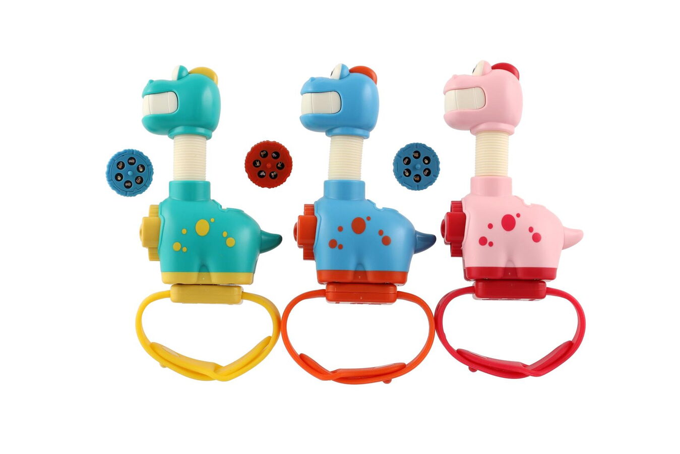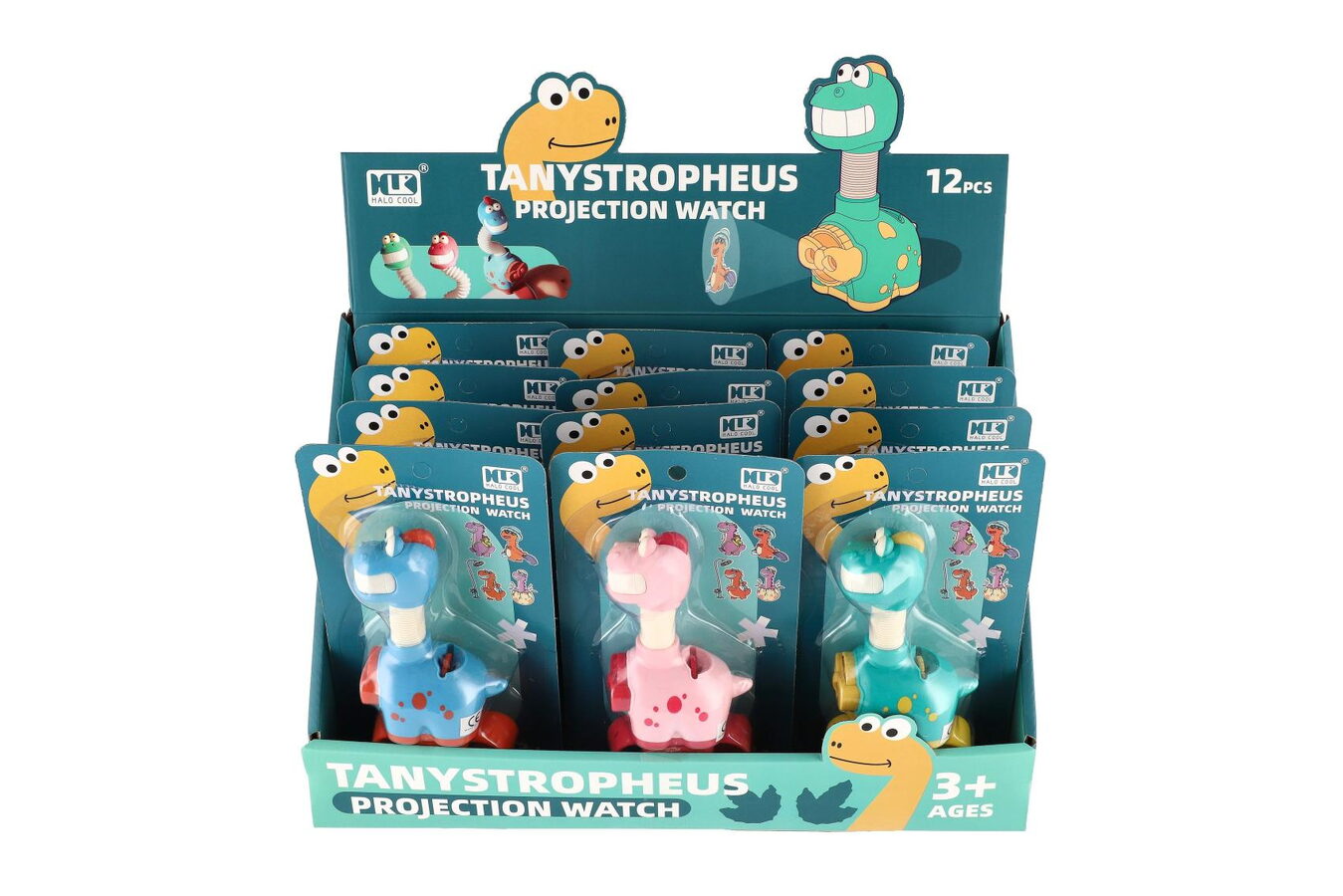 Náramkový projektor s vysouvací hlavou dinosaura. Obsahuje 2 promítací kotouče. Baterie 3x AG13 jsou součástí výrobku.