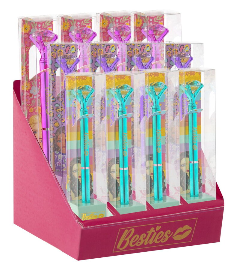 Luxusní propisovací pero luxusní s diamantem Besties – modrá náplň. Ve třech barvách – růžová, zelená a fialová.