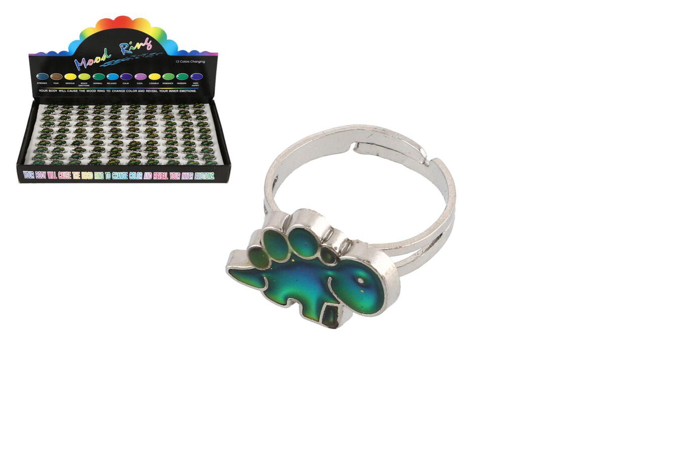Nastavitelný kovový prstýnek s motivem dinosaura, který mění barvu podle teploty těla. Díky speciálnímu termoaktivnímu povrchu prstýnek reaguje na změny teploty a mění odstíny v barevném spektru. Zábavný a poutavý doplněk pro děti, který spojuje hravost s jednoduchým fyzikálním jevem.