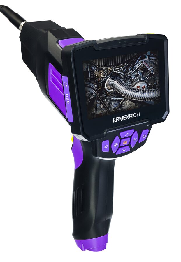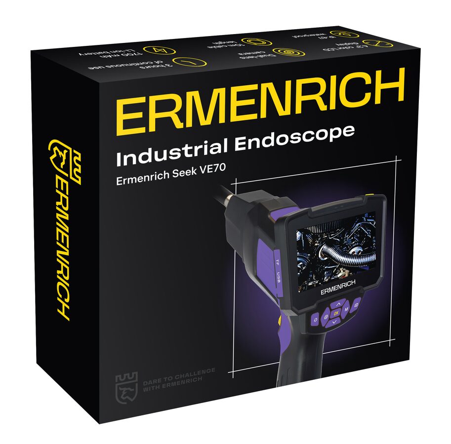 Boroskop Ermenrich Seek VE70 je vybaven dvěma HD kamerami pro zajištění důkladné kontroly úzkých míst, které jsou obtížně přístupné. Kamera je připevněna na 10metrovém ohebném kabelu s husím krkem, který umožňuje dosáhnout do vzdálených oblastí, a LED světla usnadňují práci za špatných světelných podmínek. Endoskop se používá ke kontrole kanalizačních potrubí, odtoků, stěnových konstrukcí, nákladních automobilů, domácích spotřebičů, motorů, turbín atd. Přístroj se bude hodit v každodenním životě i pro profesionální účely.