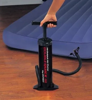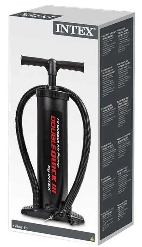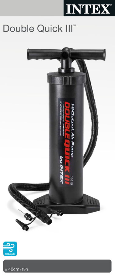 Ruční pumpa Velikost 48 cm. Dvojitý objem, dvojitý záběr, 3 1/2 krát průtok vzduchu. Pumpuje vzduch při tahu vzhůru i při pohybu dolů. Flexibilní hadička se 4 násadami je použitelná pro většinu ventilků. Z lehkého pevného plastu. Vysoko-objemová pumpa umožňuje nafukování i vyfukování.