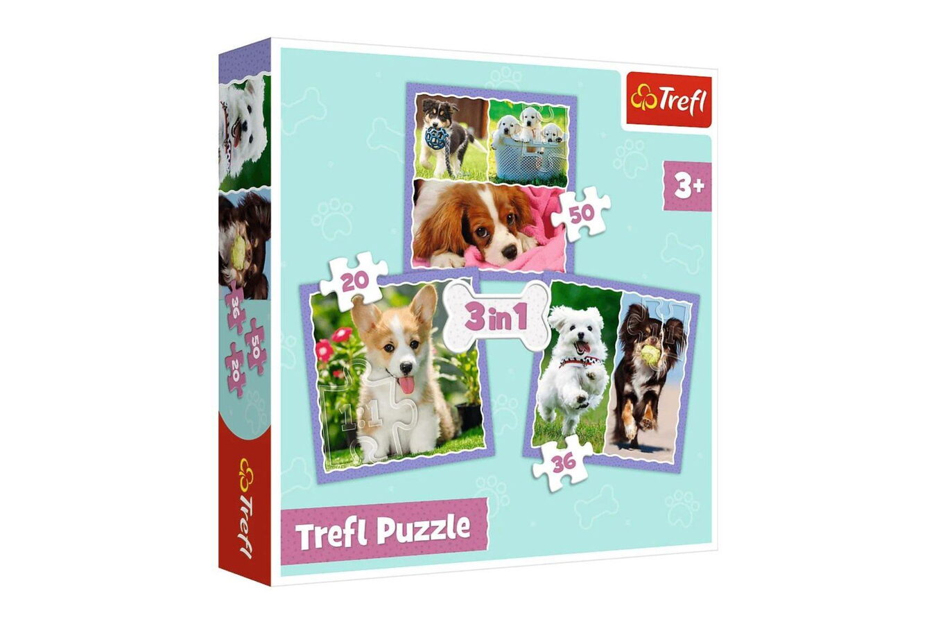 Dětské puzzle se třemi obrázky s motivem štěňat. Progresivní puzzle s různou obtížností - 3 puzzle s 20, 36 a 50 dílky, postupně vedou ke zdokonalování dítěte při skládání a zvyšování obtížnosti.