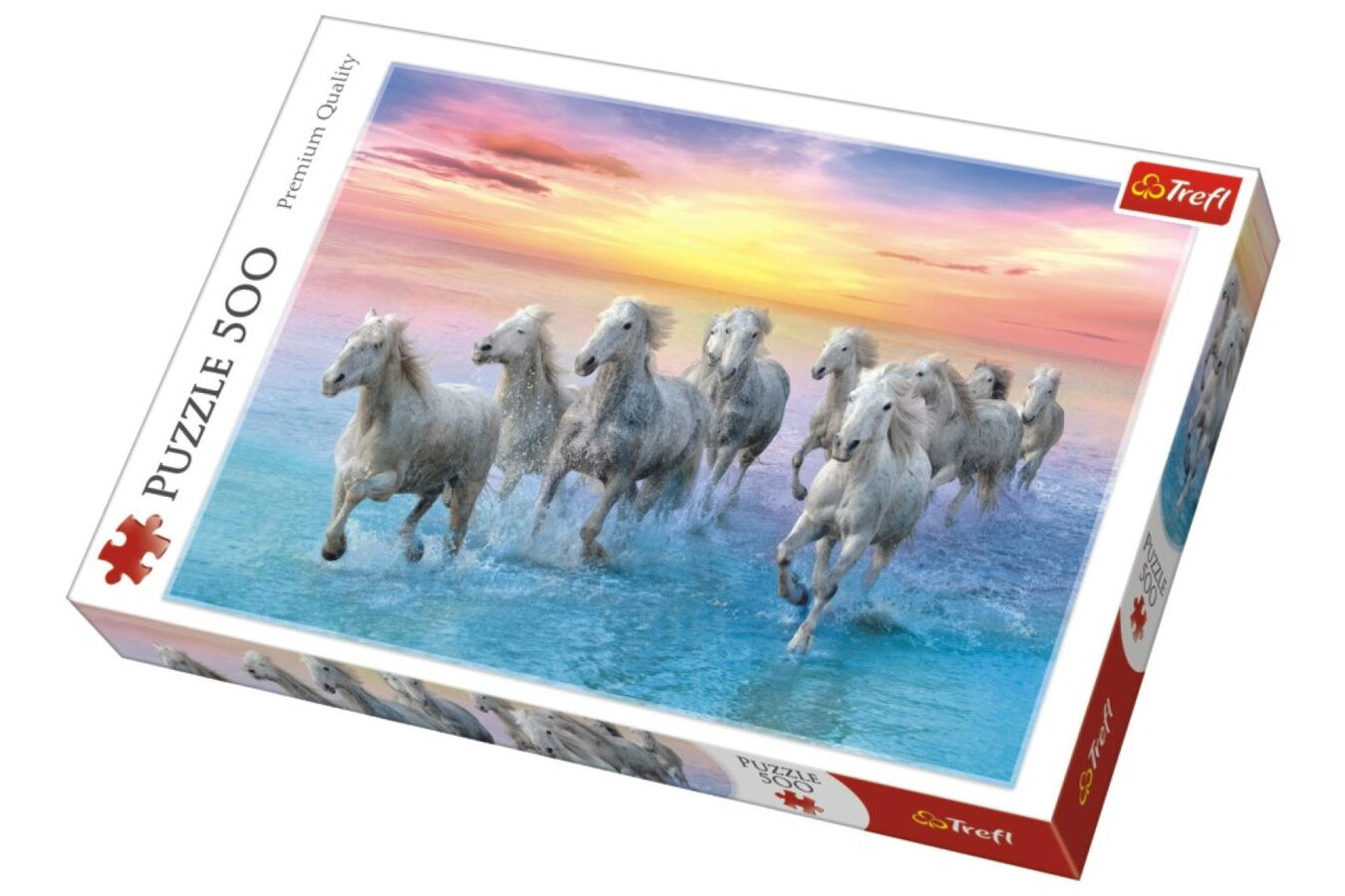Kvalitní puzzle nadchne nejen fanoušky těchto skládaček. Krásný motiv znázorňuje bílé koně v pohybu. Puzzle se skládá z 500 dílků, rozměr sestaveného obrázku: 48 x 34 cm.