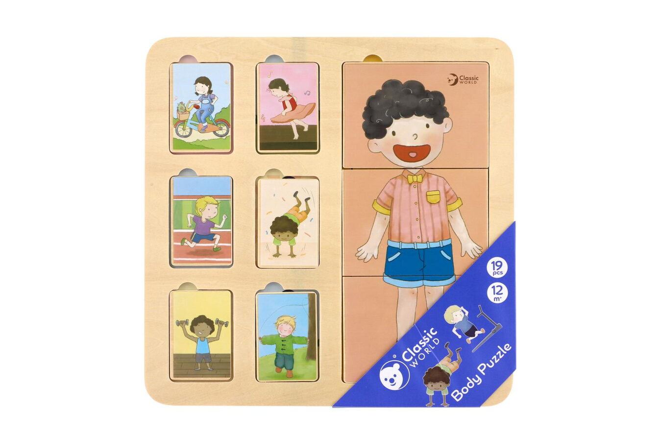 Puzzle lidské tělo má tři vrstvy. Zobrazuje strukturu těla ze svalů, orgánů a kostí. Děti mají možnost prozkoumat lidské tělo. Puzzle obsahuje 19 dřevěných dílů (včetně podložky).
