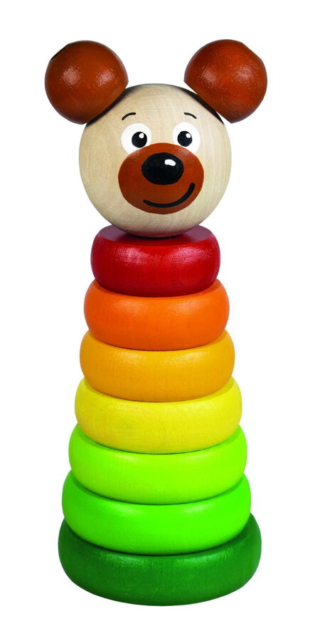 Děti skládají pyramidu z dřevěných kroužků a na vrcholek nasadí hlavičku pejska. Balení obsahuje 8 dřevěných dílků.