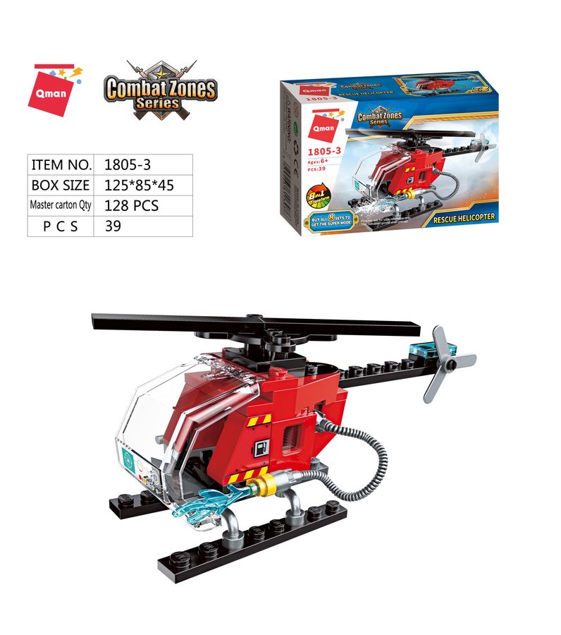 Kombinujte a pozvedejte stavbu i hru na vyšší úroveň! Sada ministavebnic hasičské techniky, jejichž kombinací vznikne možnost sestavit velký ucelený model hasičské cisterny. Vysoce variabilní stavebnice Qman z pestrobarevných plastových kostiček lze kombinovat s podobnými stavebnicemi mnoha dalších významných výrobců. Vyrobeno z kvalitního, nezávadného a odolného ABS plastu. Baleno po jednotlivých stavebnicích, v pestře potištěných papírových krabičkách. Hlavní vlastnosti:313 dílků celkem, 34–48 dílků jednotlivě2 úrovně složitosti, kombinováním sady lze sestavit velký modelkompatibilní se stavebnicemi dalších výrobců Tato sada obsahuje:Tank Vanward 1805-1 (1 ks, 48 dílků)Hasičská cisterna 1805-2 (1 ks, 40 dílků)Záchranný vrtulník 1805-3 (1 ks, 39 dílků)Záchranný člun 1805-4 (1 ks, 34 dílků)Hasičský vůz s žebříkem 1805-5 (1 ks, 41 dílků)Hasičský člun 1805-6 (1 ks, 39 dílků)Hasičské letadlo Patrol 1805-7 (1 ks, 37 dílků)Požární detektor 1805-8 (1 ks, 35 dílků)