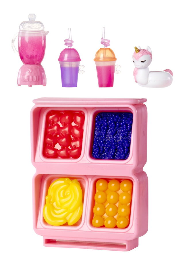 Obsah balení: Exkluzivní Malá sestřička v outfitu Bazén s duhovou skluzavkou obsahuje smoothie stánek s mixérem, ovoce, kelímky a spoustu doplňků pro den strávený u bazénu.