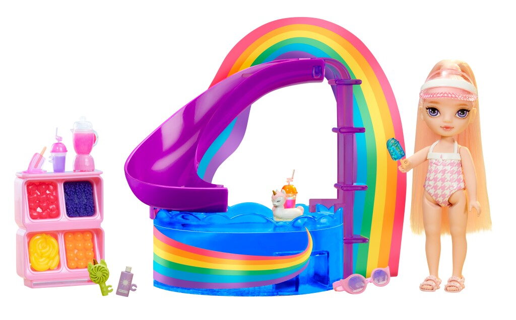 Objev kouzelný svět s herní sadou s malou sestřičkou. Čeká na tebe úžasná panenka velikosti 15 cm a její bazén. Do bazénu vede duhová skluzavka. U smoothie stánku najdeš mixér, ovoce, šálky a spoustu dalších doplňků, díky kterým si užiješ nekonečnou hru. U bazénu najdeš plováky, slunečník a další zábavné věci.