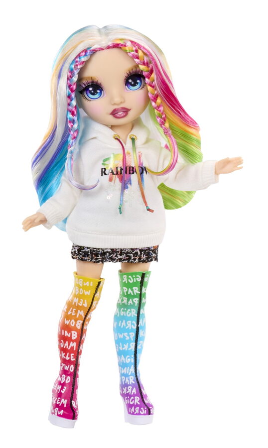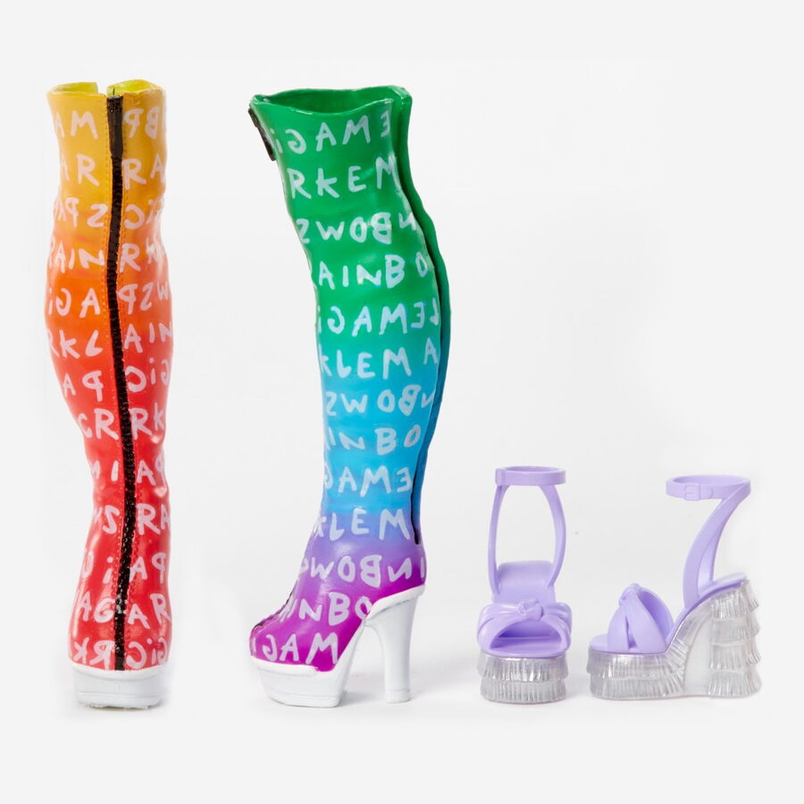 Obsah balení: • 1 panenka • Šatník s duhovou stěnou • 6 módních kousků • 2 páry bot • 2 kabelky • 1 hřeben • Šatní stojan se 4 ramínky • 4 patrové regály na boty