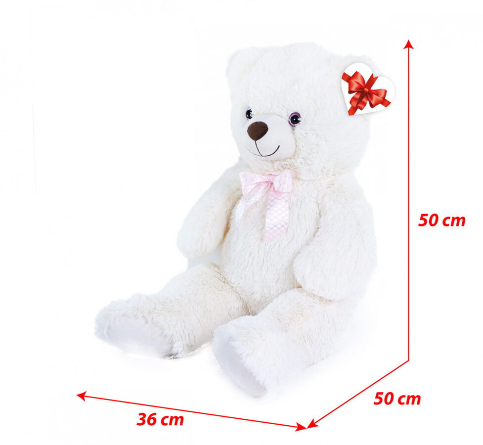 Plyšový medvěd nesmí chybět v žádném dětském pokojíčku! Medvěd ve velikosti 78 cm je vyroben z kvalitní heboučké plyše, má krémově bílou barvu a krk mu zdobí růžová saténová mašle. Tento plyšový kousek je ideálním dárkem pro malé i velké! Součástí je papírová visačka ve tvaru srdíčka, na kterou můžete napsat věnování. Hlavní vlastnosti: visačka pro věnováníruční zpracovánívysoce kvalitní plyš