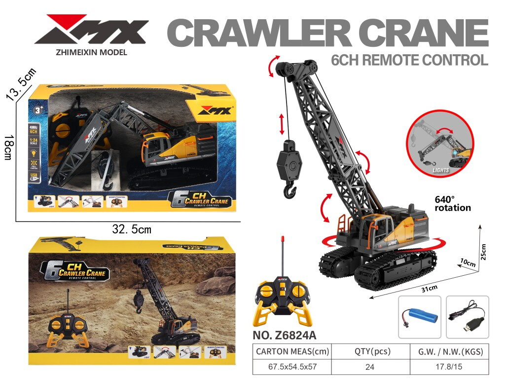 Tento 6kanálový RC pásový jeřáb s drapákem přináší plně funkční ovládání včetně pohybu vpřed a vzad, otáčení vlevo a vpravo a ovládání ramene – včetně ohybu kloubu a pohybu celého ramene. Zvedací funkce a světelné efekty zvyšují realističnost hry. Ideální pro děti i sběratele. Nabíjení přes USB, ovládání na frekvenci 40 MHz s dosahem až 15 metrů.