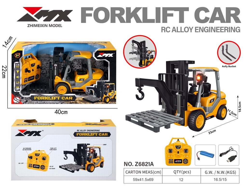 9 kanálů, plná funkčnost Pohyb vidlice nahoru/dolů Jízda vpřed/vzad, otáčení vlevo/vpravo Automatická demonstrační funkce Světelné a zvukové efekty Měřítko: 1:18 Frekvence: 2,4 GHz (2405–2475 MHz) Max. výkon: 0 dBm Dosah dálkového ovládání: 20–30 m Rychlost: 2–3 km/h USB nabíjení