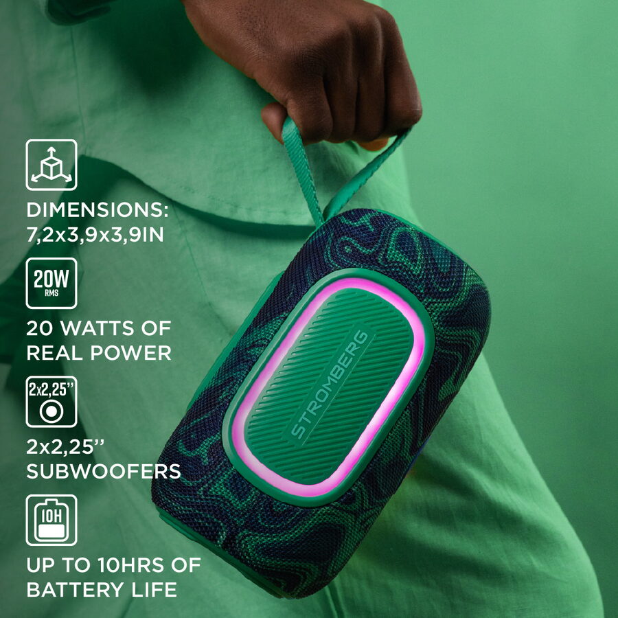 Reproduktor Stromberg BURST-2 – parťák na každou akci. Futuristický design, výkon 20 W a výdrž až 10 hodin, to vše nabízí bluetooth reproduktor Stromberg BURST-2, který oživí každou párty, piknik nebo večer s přáteli. Díky voděodolnosti IPX5 se nezalekne deště ani stříkající vody od bazénu. Můžete jej tedy vzít s sebou doslova kamkoliv.