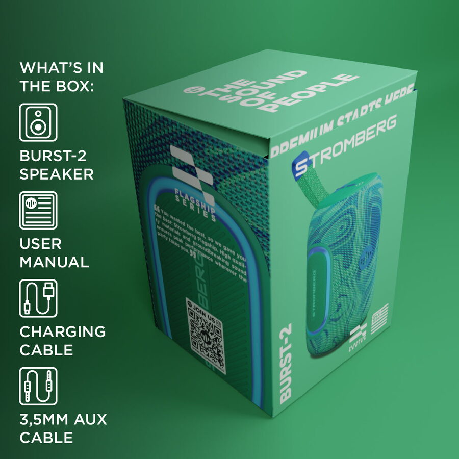 BURST-2 je ideální volbou pro každého, kdo nechce dělat kompromisy mezi zvukem, výdrží a vzhledem. Díky funkci Stromberg Connect (TWS) snadno spojíte dva reproduktory a vytvoříte působivý stereo efekt. Reproduktor váží jen 0,85 kg, takže ho bez problému vezmete kamkoliv s sebou. Kombinace dvou 2,25" reproduktorů, RGB podsvícení a jednoduchého ovládání dělá z BURST-2 skvělý doplněk pro každou situaci.
