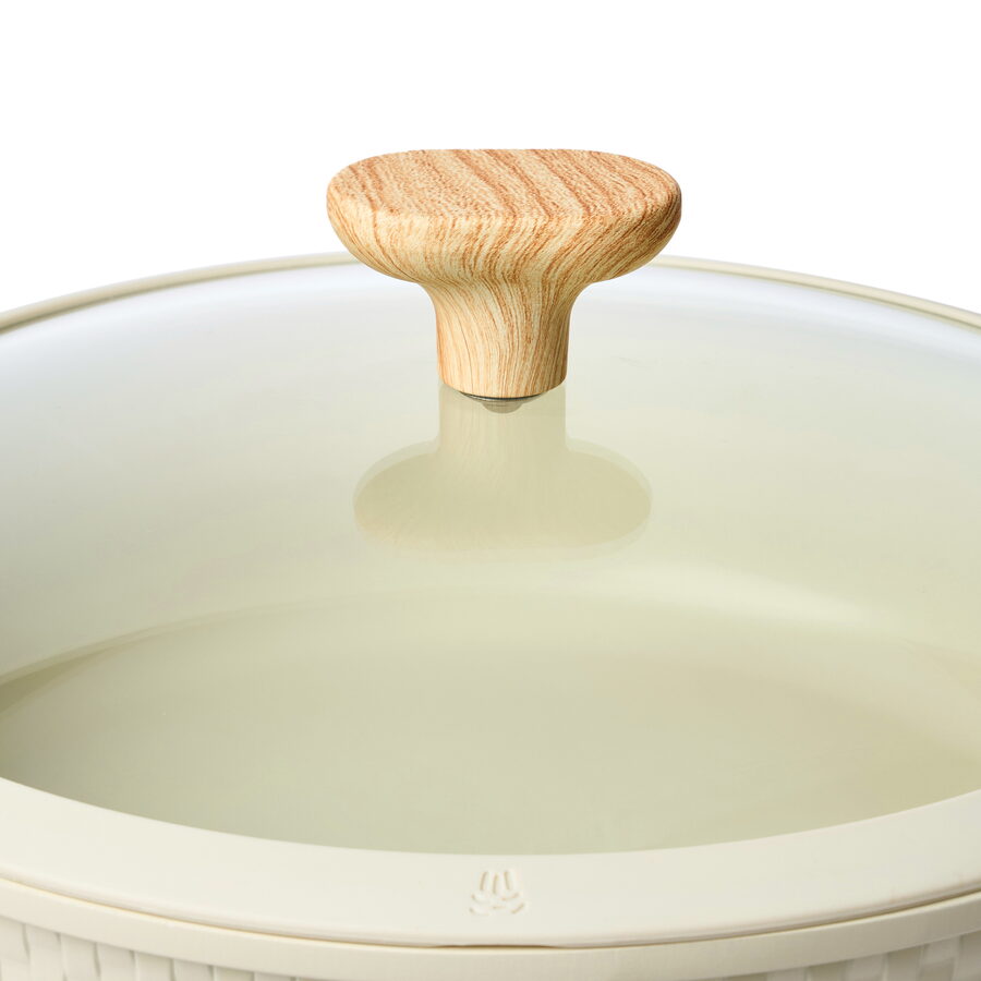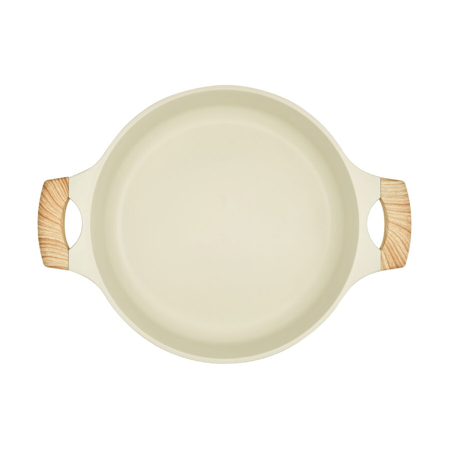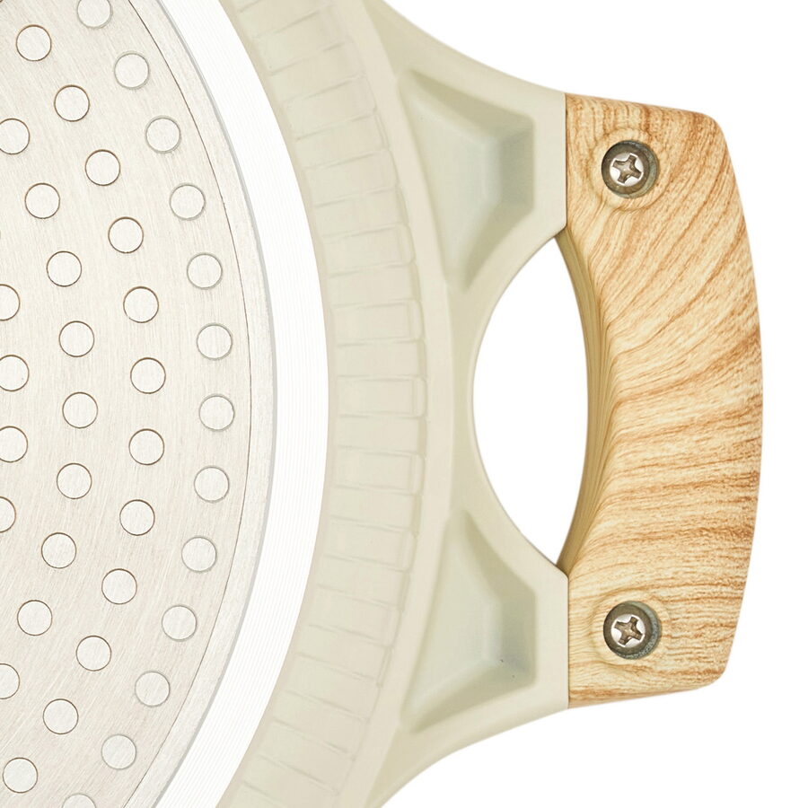 Rukojeti s povrchovou úpravou Soft Touch v designu dřeva nabízejí pohodlný a neklouzavý úchop. Zůstávají chladné na dotek a umožňují bezpečnou manipulaci i při vyšších teplotách. Praktické očko navíc umožňuje snadné zavěšení na háček, takže nádobí nezabírá místo a vaše kuchyně zůstává přehledná.