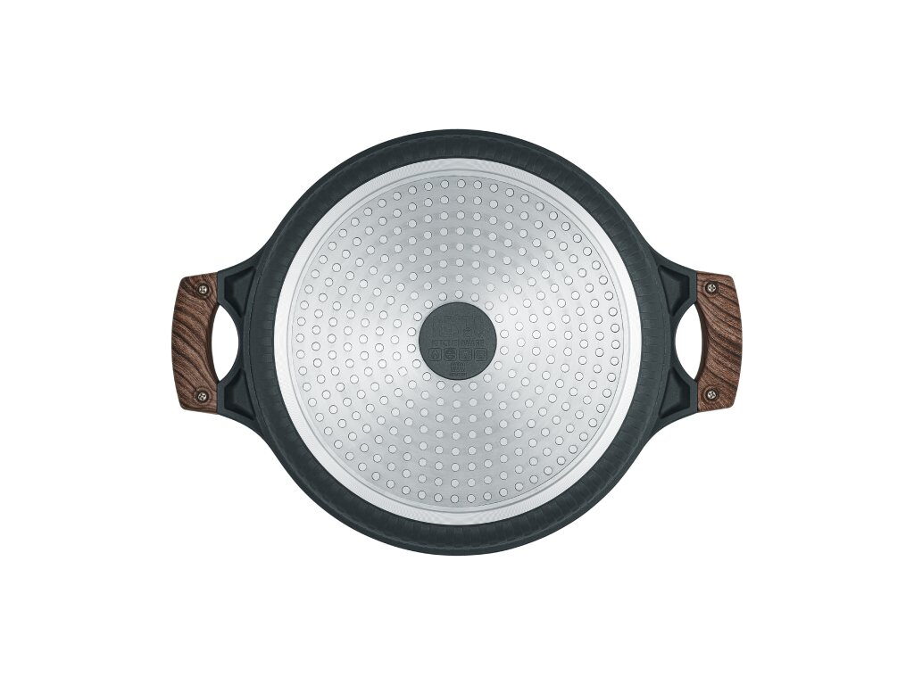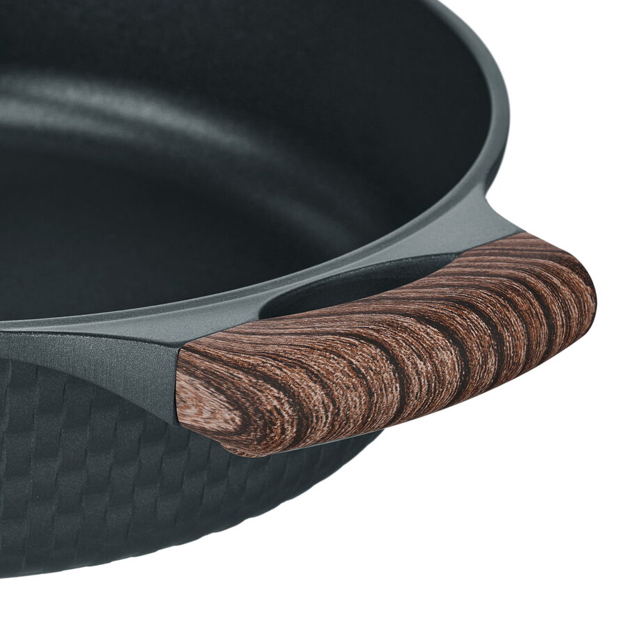 Skleněné poklice se silikonovým lemem a otvorem pro únik páry podporují dokonalý výsledek při přípravě jídel. Ergonomické dřevěné rukojeti s povrchem Soft Touch a univerzální indukční dno pak dělají z této kolekce spolehlivou volbu pro každou kuchyni.