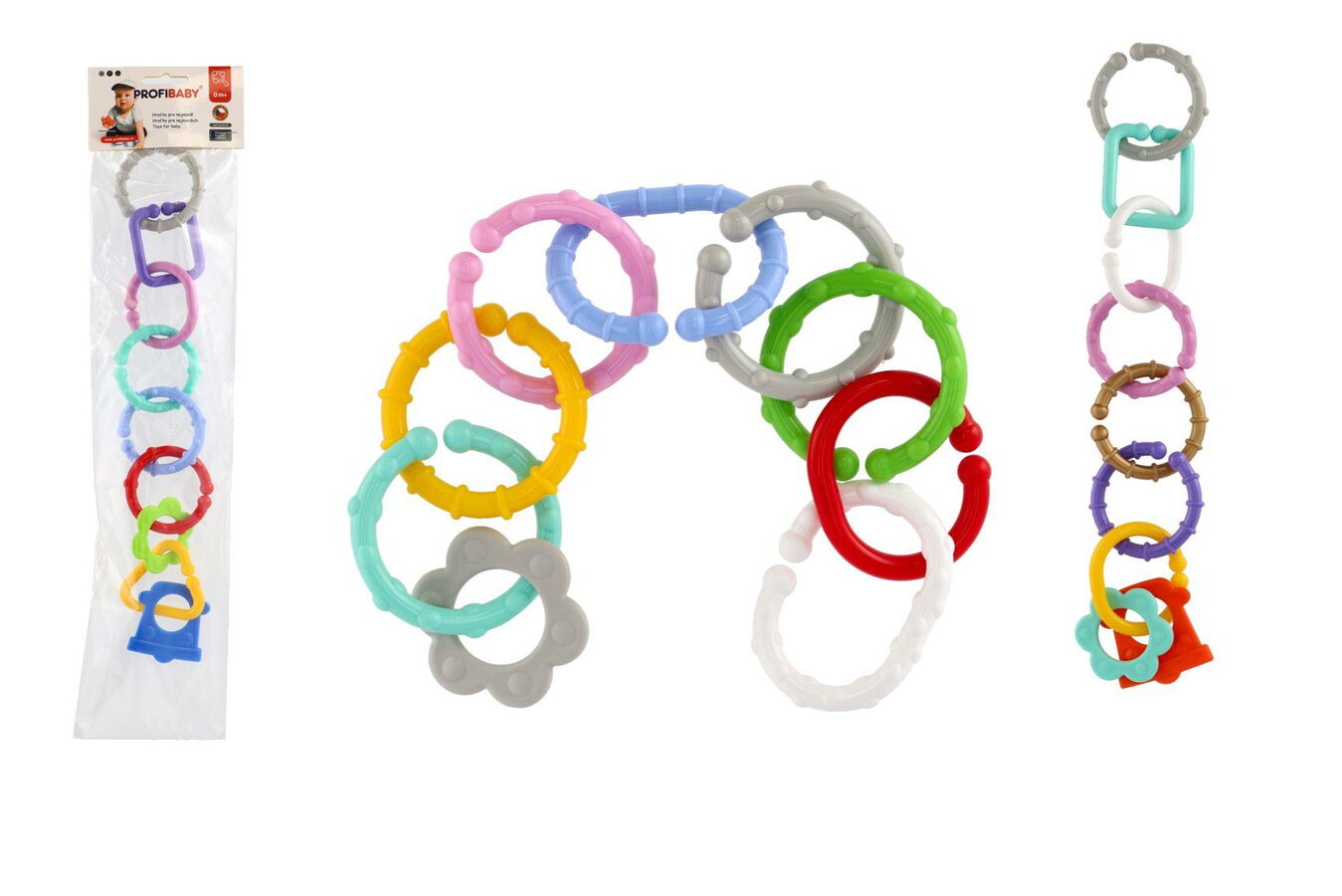Plastový řetěz pro nejmenší. Řetěz je tvořen 8 dílky různých geometrických tvarů. Každý dílek má velikost 6 cm. Z jednotlivých částí je možné vytvořit krásný, různě dlouhý řetěz, přesně podle Vašich představ. Pestrobarevná hračka miminko okamžitě zaujme a zabaví na dlouhou dobu.