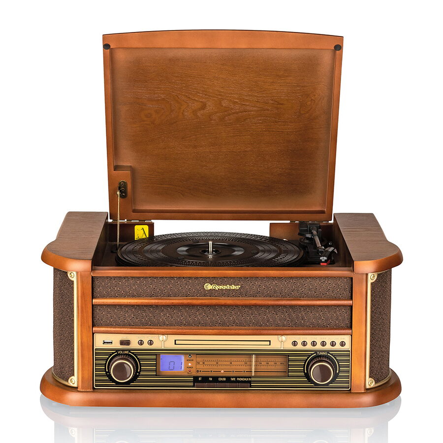 Retro hifi systém v dřevěném provedení, s BLUETOOTH, CD/MP3 přehrávač, gramofon, dálkové ovládání, 2 vestavěné reproduktory, LED display, dálkové ovládání. funkce kopírování z gramofonu, kazety na formát MP3 na USB. CD přehrávač: přední vstup, přehrává CD-R/RW, MP3, třídění ve formátu MP3 dle skladby nebo alba, programování. Tuner (radio) analogové ladění (stupnice) AM/FM, Stereo, Kazetový přehrávač s autostopem. Audio: 40W PMPO 2x5W RMS, Gramofon: 35/45/78 otáček, autostop. Napájení 230V 50 Hz