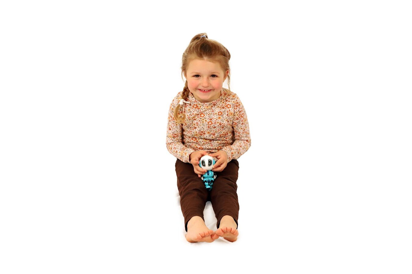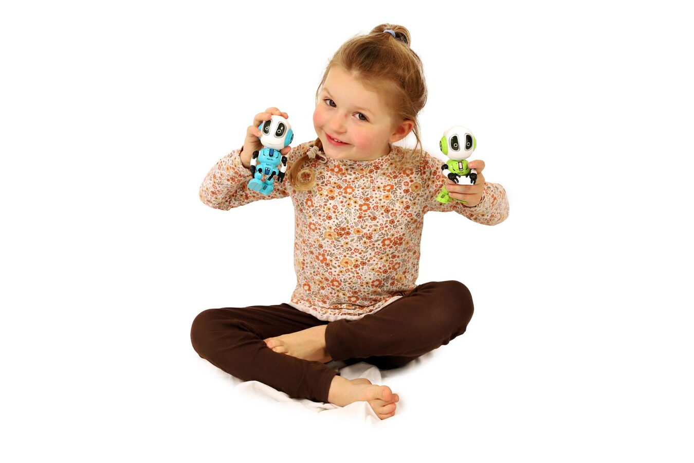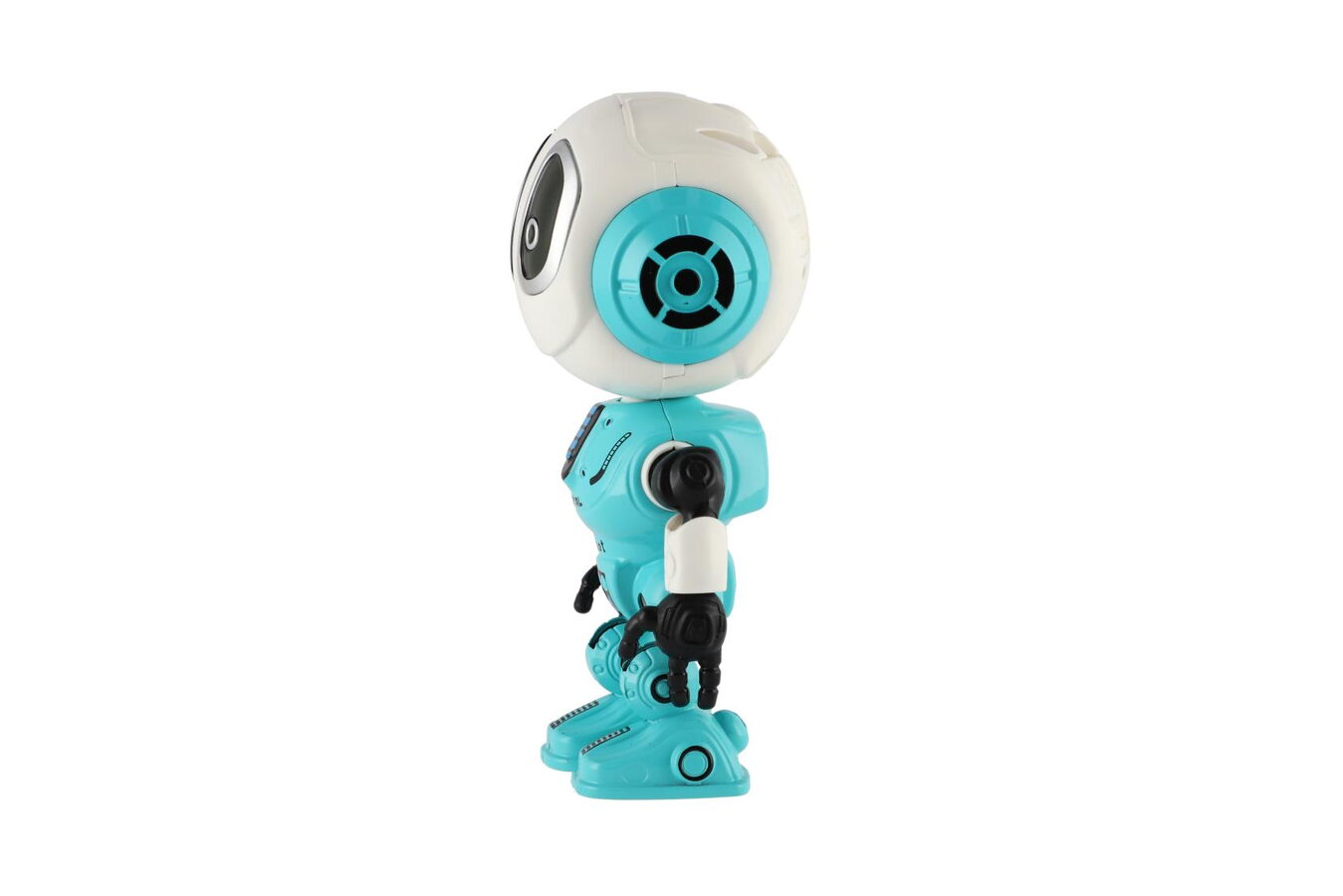Robot modrý opakuje vše, co řeknete. Stiskem tlačítka zapnete, dalším stiskem můžete začít mluvit, a stejným tlačítkem také vypnete. Svítí a bliká a je velikosti 12 cm. Baterie 3x AG13 jsou součástí výrobku.