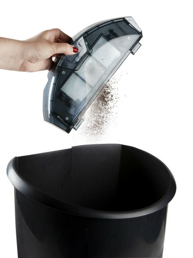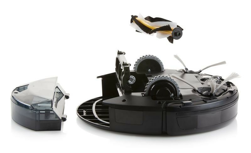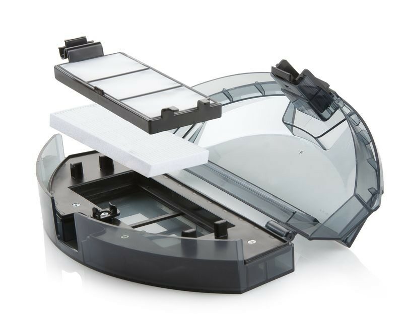 - V balení jsou: dálkové ovládání, nabíjecí stanice s adaptérem, 2 boční náhradní kartáče, 1 náhradní HEPA.