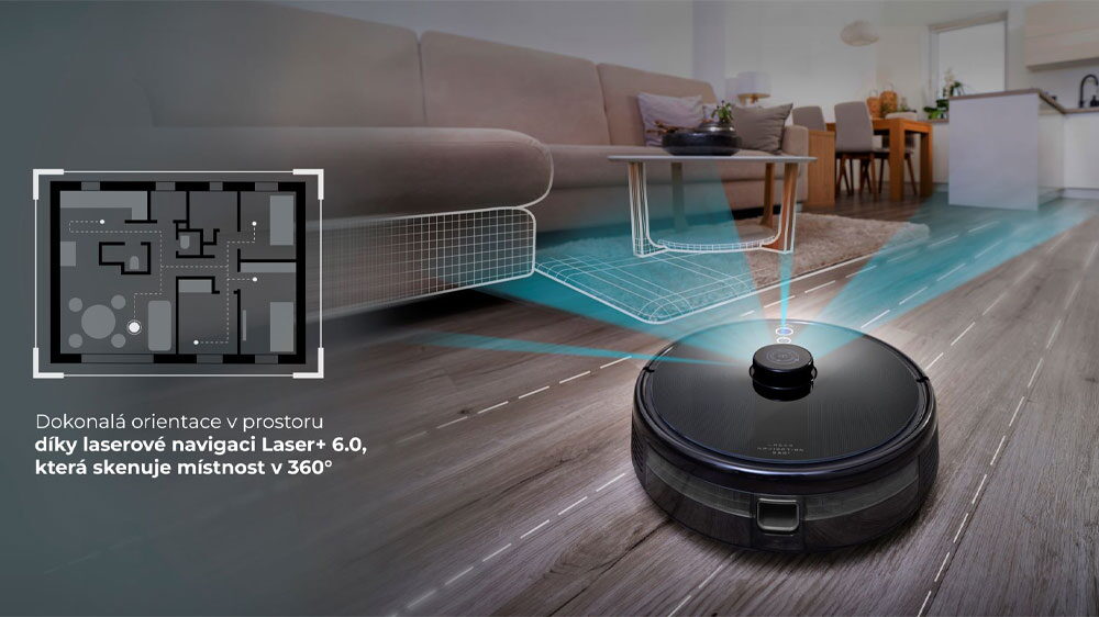 - Dokonalá orientace v prostoru díky laserovému navádění - laserový senzor skenuje místnost v 360°