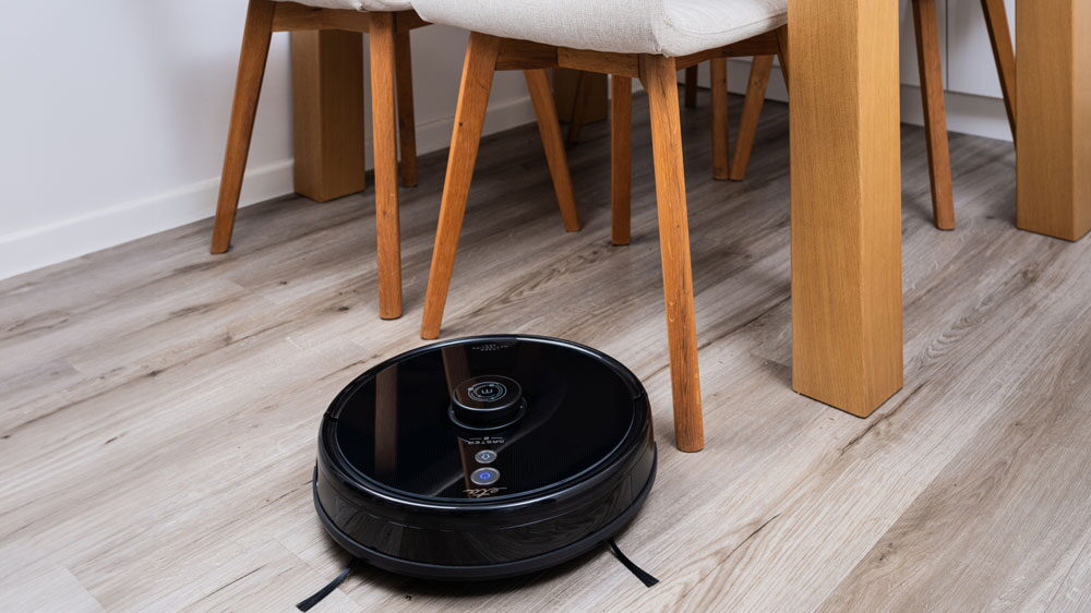 Díky své kompaktní výšce 9,7 cm zvládne uklidit i pod nižším nábytkem. Na podlaze jej drží odolná kolečka s pohonem, která velmi dobře překonávají nerovnosti. Problém mu tak nedělají ani přechodové lišty do výšky 1,5 cm a koberce do výšky vlasu 1 cm.