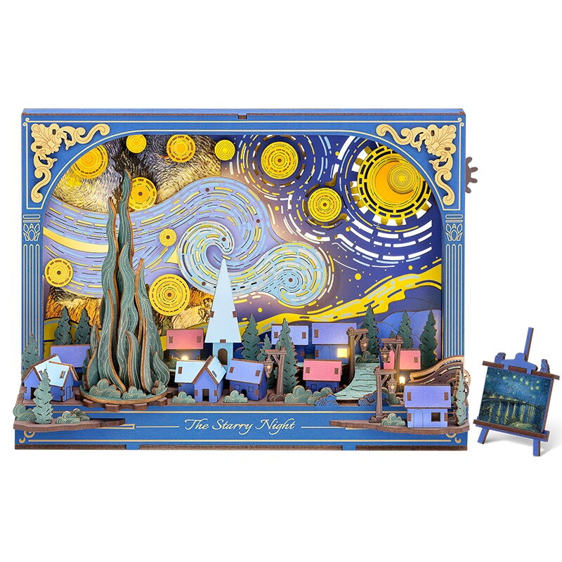Dřevěná 3D skládačka Hvězdná noc nabízí jedinečný pohled na klidný soumrak z neobvyklé perspektivy. Mohutné mraky se vlní a splývají s noční oblohou nad tichou, spící vesnicí, zatímco hravé mechanické detaily, jako jsou hvězdy a měsíc poháněné ozubenými koly, otočný cypřiš či pohyblivé kolo vozu, dodávají této dřevěné stavebnici život a hloubku. Skládačka slouží jako stylová stolní dekorace s vyměnitelným pozadím, které umožňuje měnit atmosféru a nabízet stále nový vizuální dojem. Jemné dýchající podsvícení v pozadí vytváří hřejivé světlo, které zvýrazňuje detaily celé scény a proměňuje tuto dekoraci v okouzlující noční lampičku. Hvězdná noc vnese do interiéru kouzelnou atmosféru, rozzáří večery a dodá každodennímu prostoru nádech fantazie a barev. Hlavní vlastnosti: 238 dílkůdoba skládání 3 hodinyLED osvětlení2x baterie AAA/LR03/AM4 1,5 V (nejsou součástí balení)nízká obtížnost sestaveníbez použití lepidlavýjimečný a realistický vzhledvhodná jako dekorace na poličku nebo zeďrozvíjí logické a motorické dovednostipodporuje trpělivost dětíideální dárek nebo jedinečná dekorace