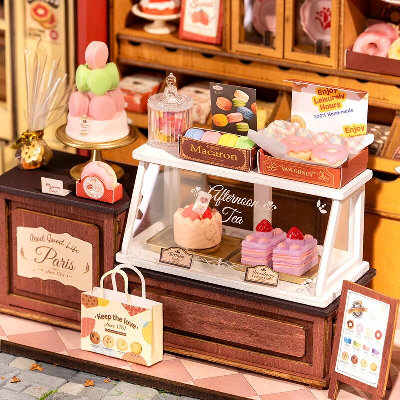 Je čas na něco sladkého! Vyberte si z vynikajících dezertů z nabídky útulné francouzské cukrárny, které jsou vystavené v dřevěných policích nebo skleněné vitríně. Nabídka je široká. Máte chuť na makronky, máslové sušenky, dortíky, čokoládu nebo donuty? Nebo si raději dáte čaj či kávu? V dóze jsou připraveny dokonce gumové bonbóny pro malé mlsouny! Dvířka skříněk jsou otevírací, takže si můžete zboží vystavit podle svého přání. Vychutnejte si atmosféru klidu a pohody, která je umocněna příjemným LED osvětlením. 3D skládačka je skvělý způsob, jak si užít kreativní a edukativní hraní a zároveň vytvořit nádherný model, který se může stát netradičním dárkem či ozdobou interiéru. Skládání 3D skládačky podporuje rozvoj jemné motoriky, prostorového myšlení a trpělivosti. Je to možnost, jak kombinovat zábavu se vzděláváním. Všechny přesně vyřezané dílky do sebe lehce zapadnou bez použití lepidla či nástrojů, aby výsledek byl stabilní a odolný. Skládačka je dodávána v nesloženém stavu, zabalená v krabici s podrobným návodem k sestavení. K napájení slouží 2x AAA /LR03/AM4 1,5 V (nejsou součástí balení). Hlavní vlastnosti: 242 dílkůdoba skládání 4 hodstřední obtížnost sestaveníLED osvětlenísestavení bez použití lepidla a nástrojůvýjimečný vzhledvhodné pro děti i dospělérozvíjí logické a motorické dovednostipodporuje trpělivost dětíideální jako dárek nebo jedinečná dekoracenapájení pomocí 2x AAA /LR03/AM4 1,5 V (nejsou součástí balení)