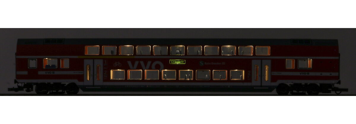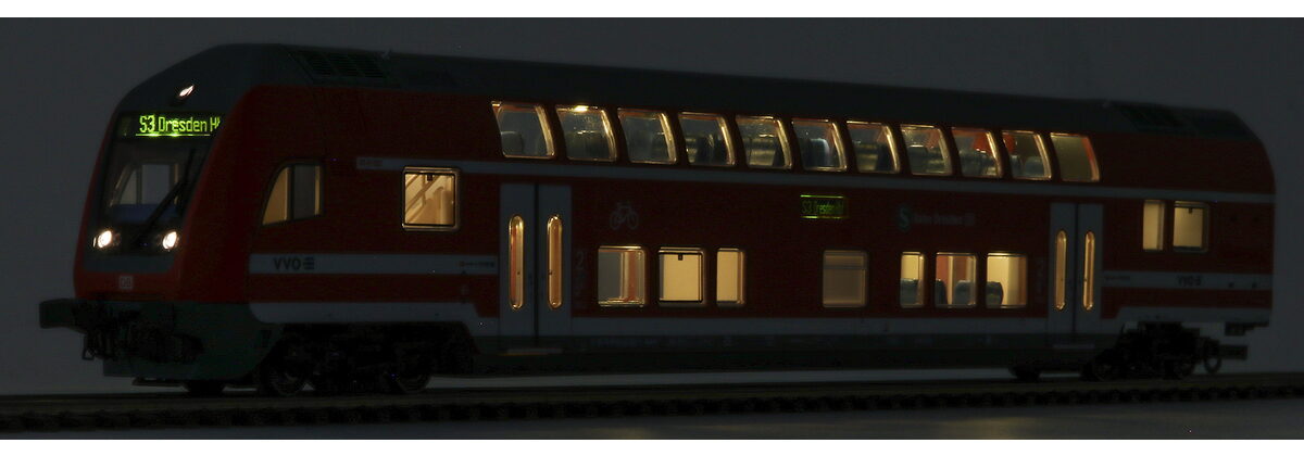 Sada dvou dvoupatrových vagónů DB. Skládá se z dvoupatrového vozu 1./2. třídy typu DABpza a dvoupatrového řídícího vozu 2. třídy typu DBpbzfa. Specifikace: napájení DC digitálnídigitální ovládánídélka přes vyrovnávací paměti 621 mmspojka – šachta NEM 362 s kinematikou KKrozchod H0epocha VIdopravce DB AG3 světlomety / 2 zadní světla, závislá na směru jízdyLed světlomet Hlavní vlastnosti: vnitřní Led osvětlení kabinydigitální dekodér PluX22typ dekodéru MX633P22elektrické rozhraní pro trakční vozidla PluX22 Dokumentace: návod k obsluze DE