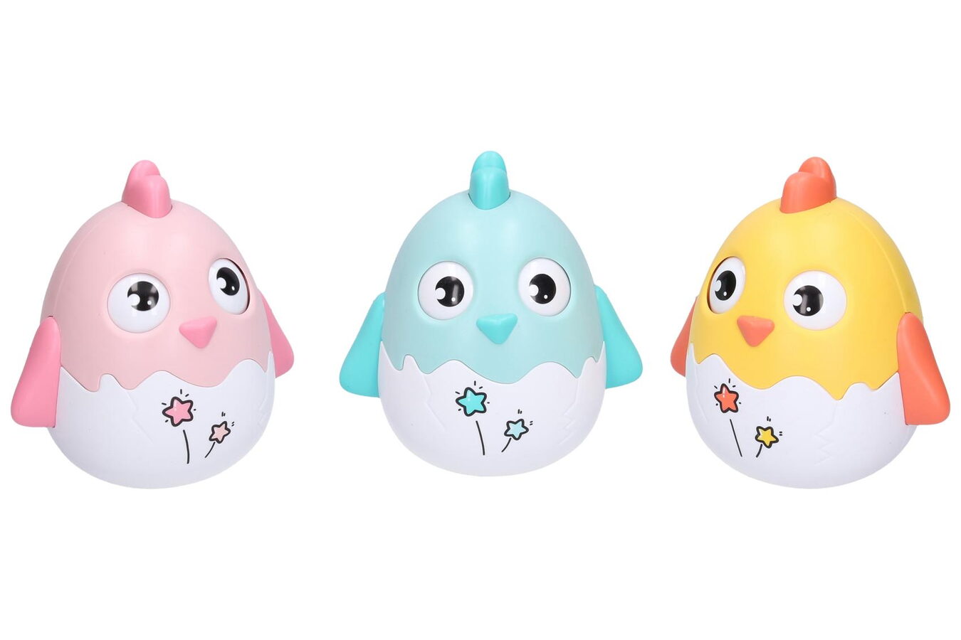 Roly poly kuře s rolničkami. Velikost 12x9x12 cm. Display box 9 ks. 3 varianty - žlutá, růžová, modrá.
