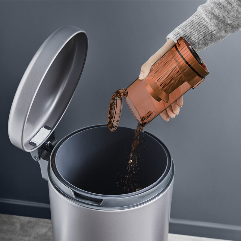 Vysavač je vybaven odnímatelnou nádobkou na prach o objemu 0,65 l a systémem cyklónové filtrace, což umožňuje efektivní třídění prachu a snadné vysypání. Filtrační systém dokáže zachytit až 99,9 % prachových částic a alergenů — vhodné i pro alergiky.