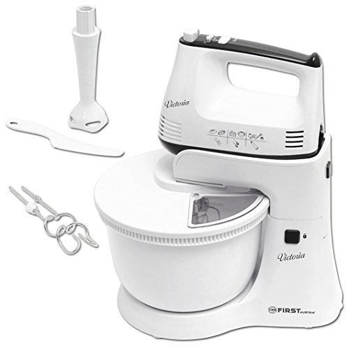 Ruční šlehač s mísou First Austria FA5257-1, příkon 300W, ruční šlahač s automaticky otočnou mísou o celkovém objemu 3,5 litru, nerezové háky a metly pro zpracování těst, plastový tyčový mixer.