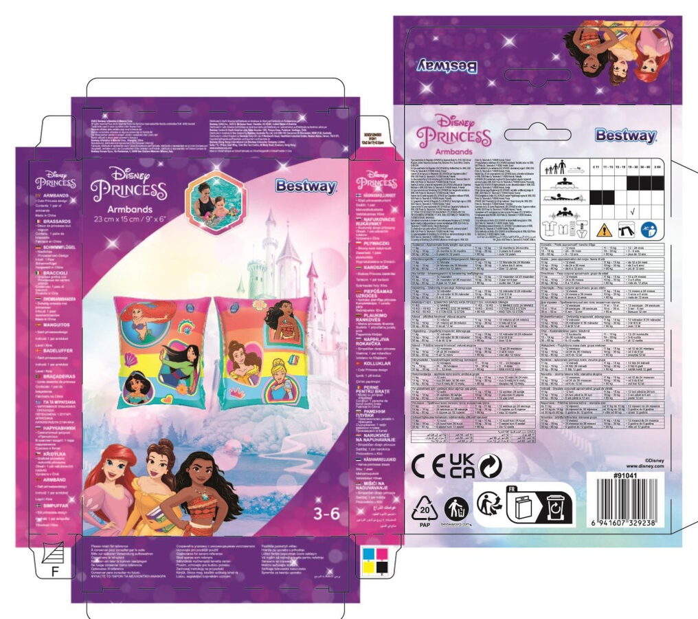 Nafukovací rukávky v designu Disney Princess pro děti od 3 do 6 let o velikosti 23×15 cm. Dvě vzduchové komory.