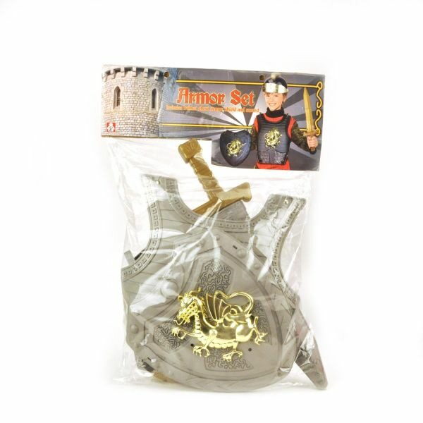 Rytířská sada v síťce obsahuje přilbu, štít, meč s pochvou a brnění. Vyrobeno z kvalitního plastu.