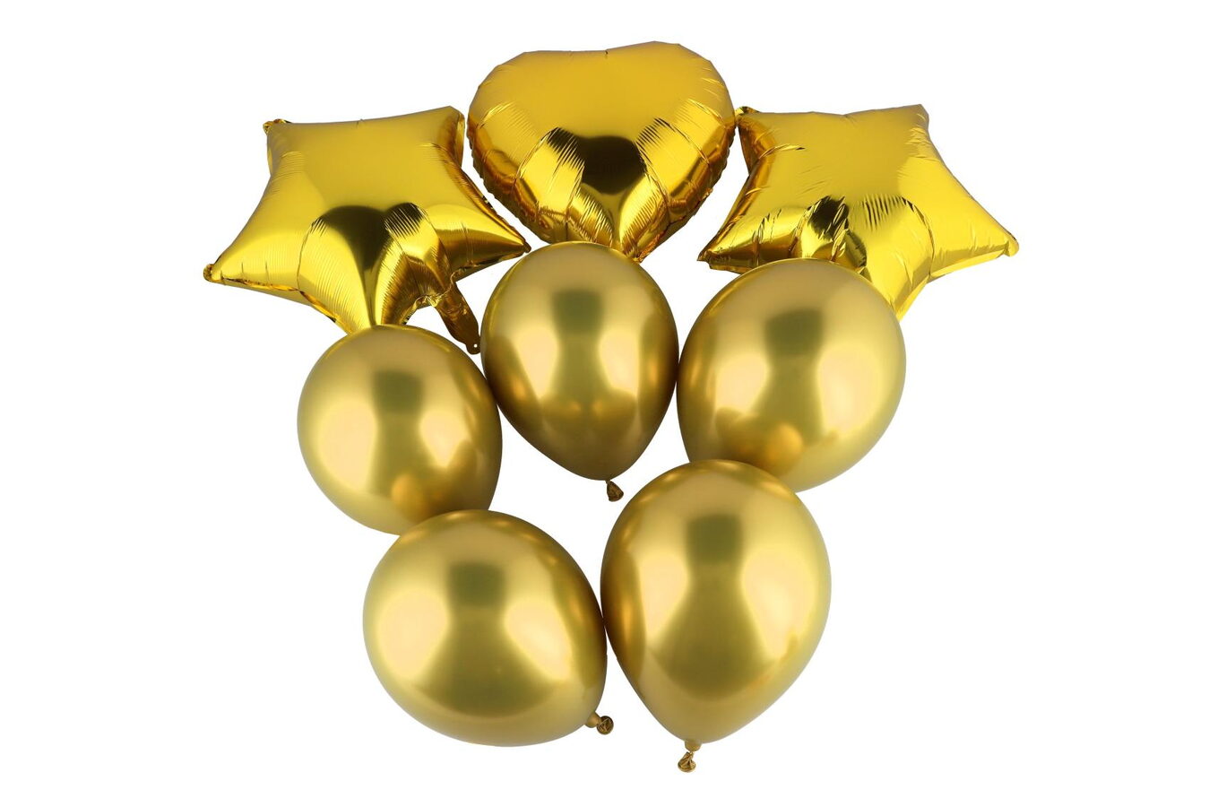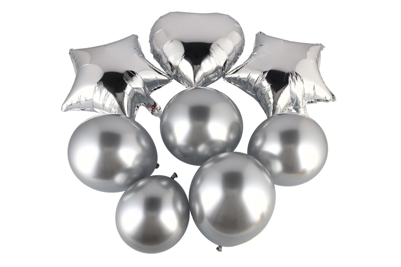 Obsahuje celkem 8 kusů – 1x fóliový balonek ve tvaru srdce, 2x fóliový hvězdicový balonek a 5x kulatých latexových balónků v ladících pastelových barvách.