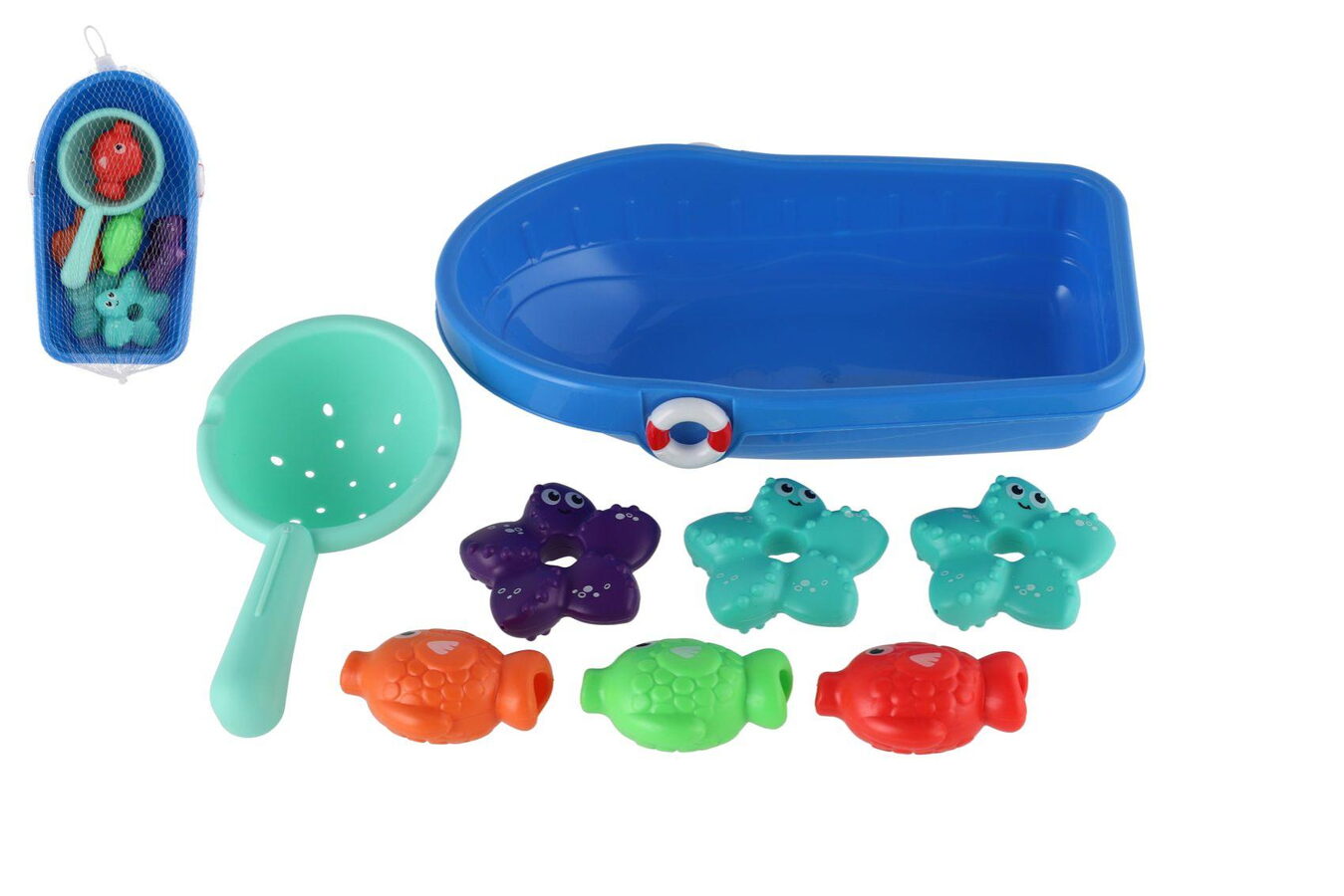 Sada do vany plast lodička, sítko s mořskými zvířátky v síťce 14x24cm