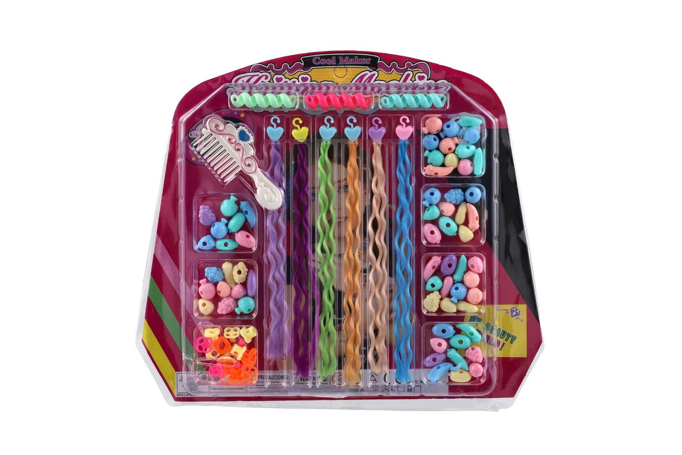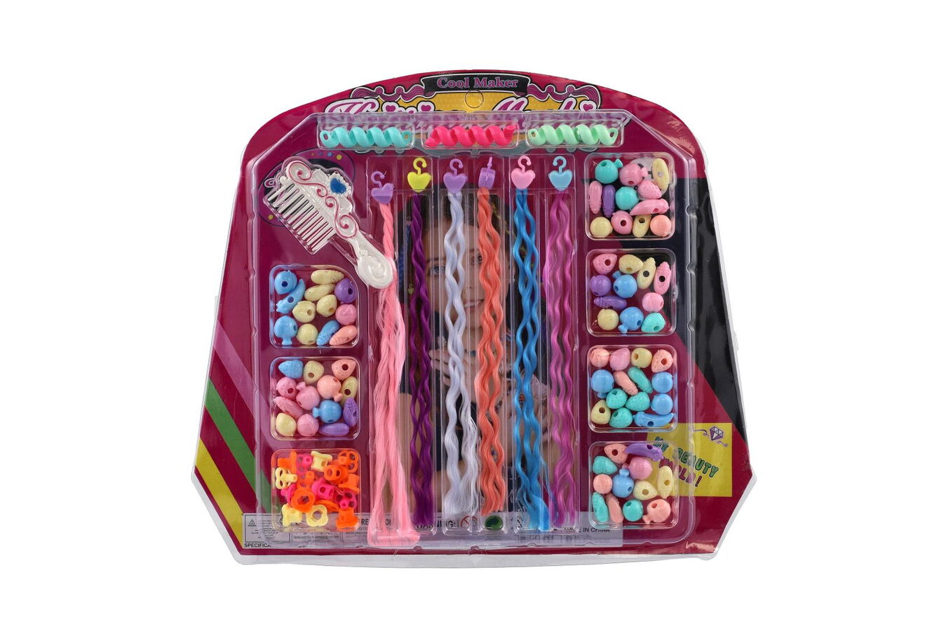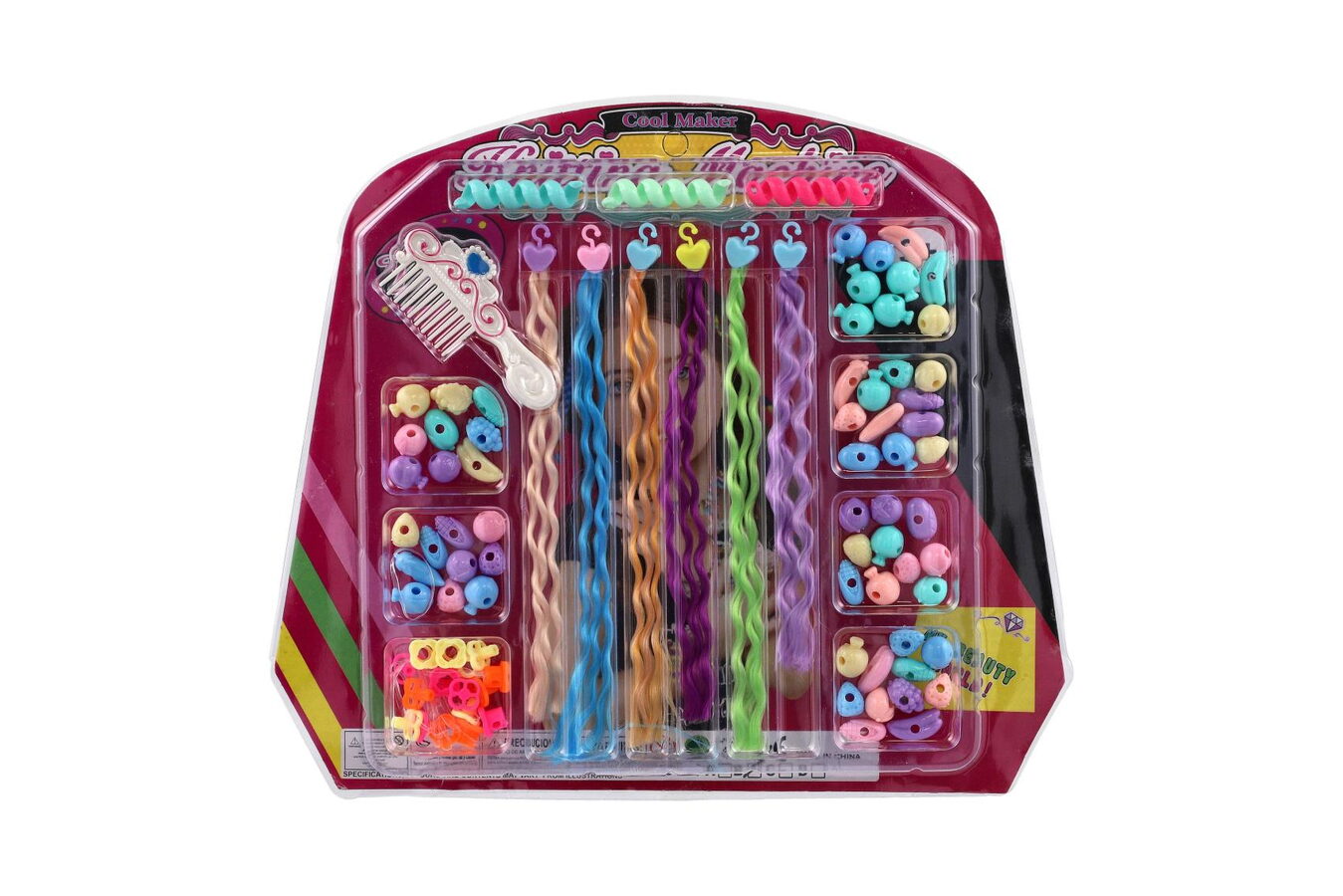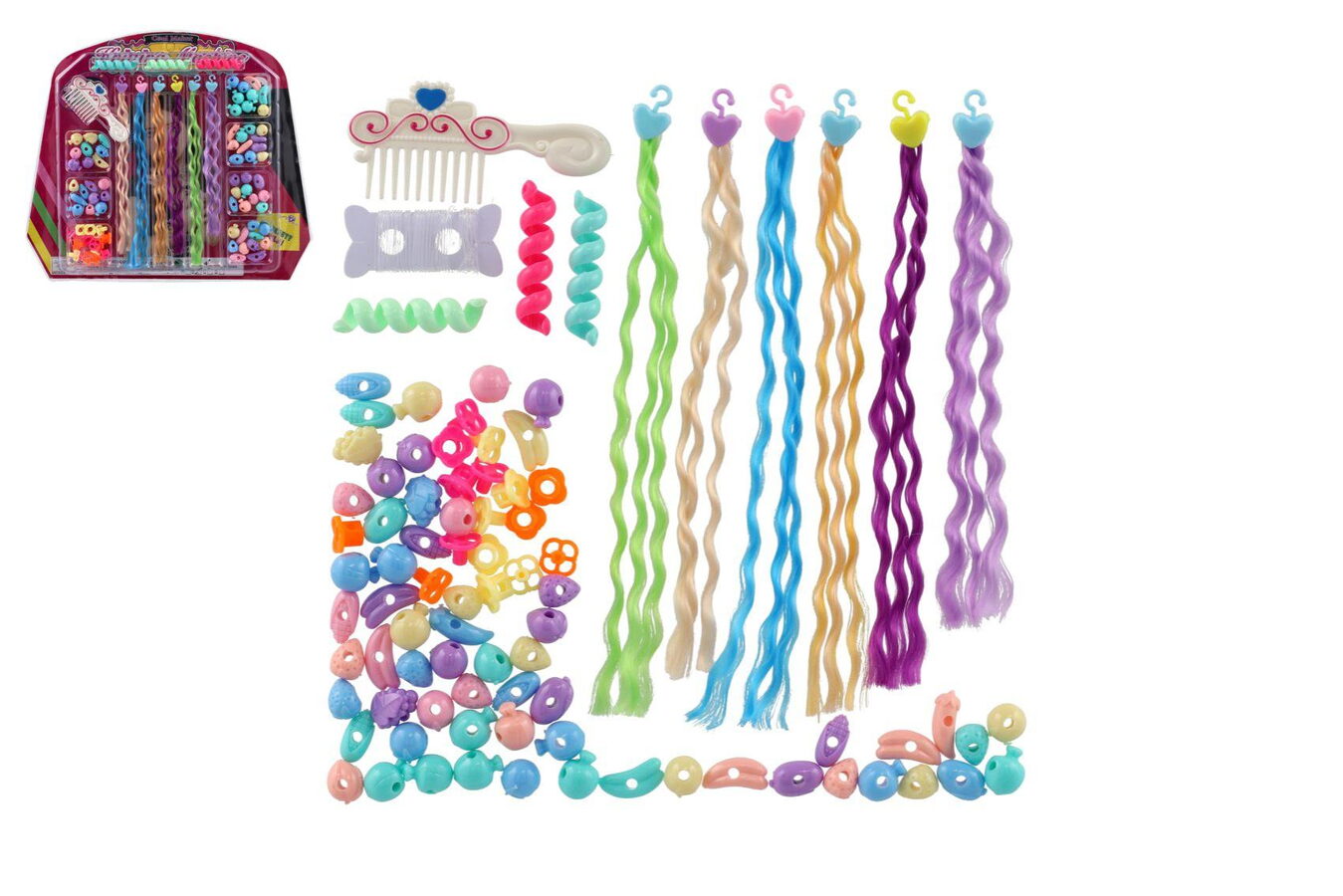 Sada korálků a copánků na vlasy plast mix druhů na kartě 30x26x3cm