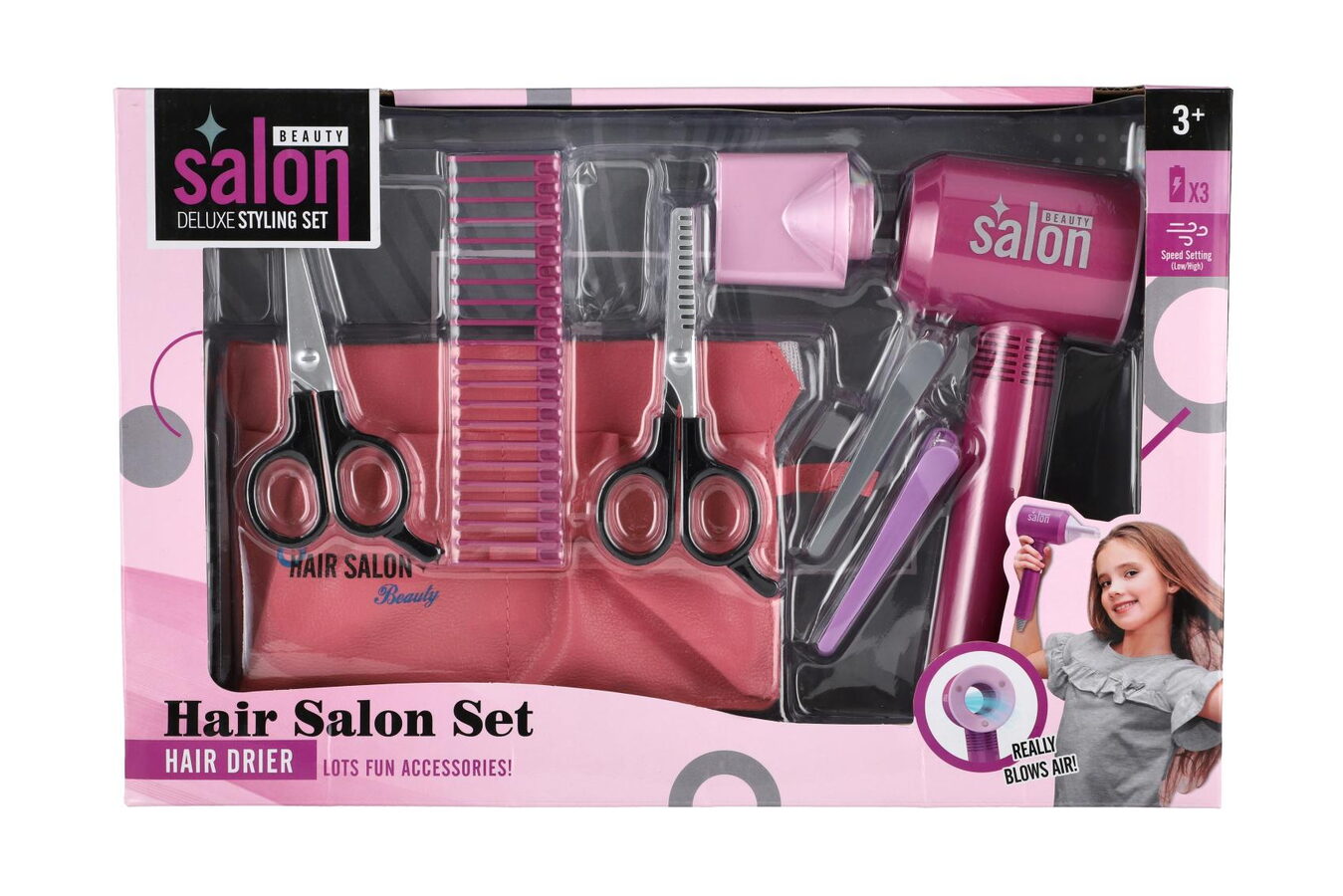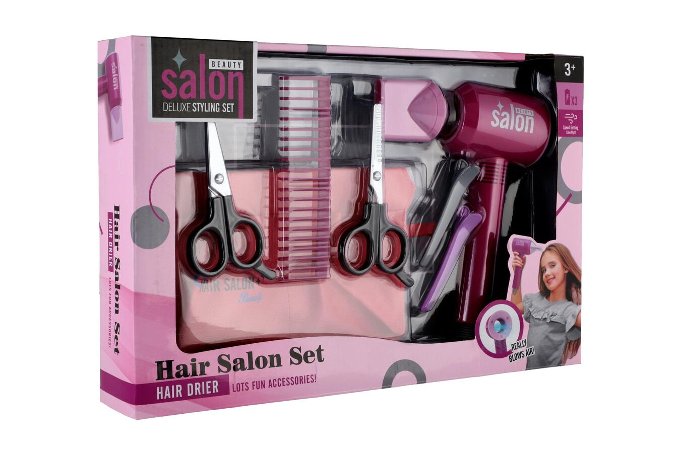 Každá malá parádnice musí mít ve své sbírce tuto sadu krásy s fénem a se spoustou doplňků. Sada je vhodná pro malé kadeřnice, mohou si tak učesat a vyparádit panenku dle své fantazie. Sada je vyrobena z kvalitního plastu. Sada obsahuje spoustu doplňků včetně fénu. Fén je na baterie. Baterie 3x AAA nejsou součástí balení.