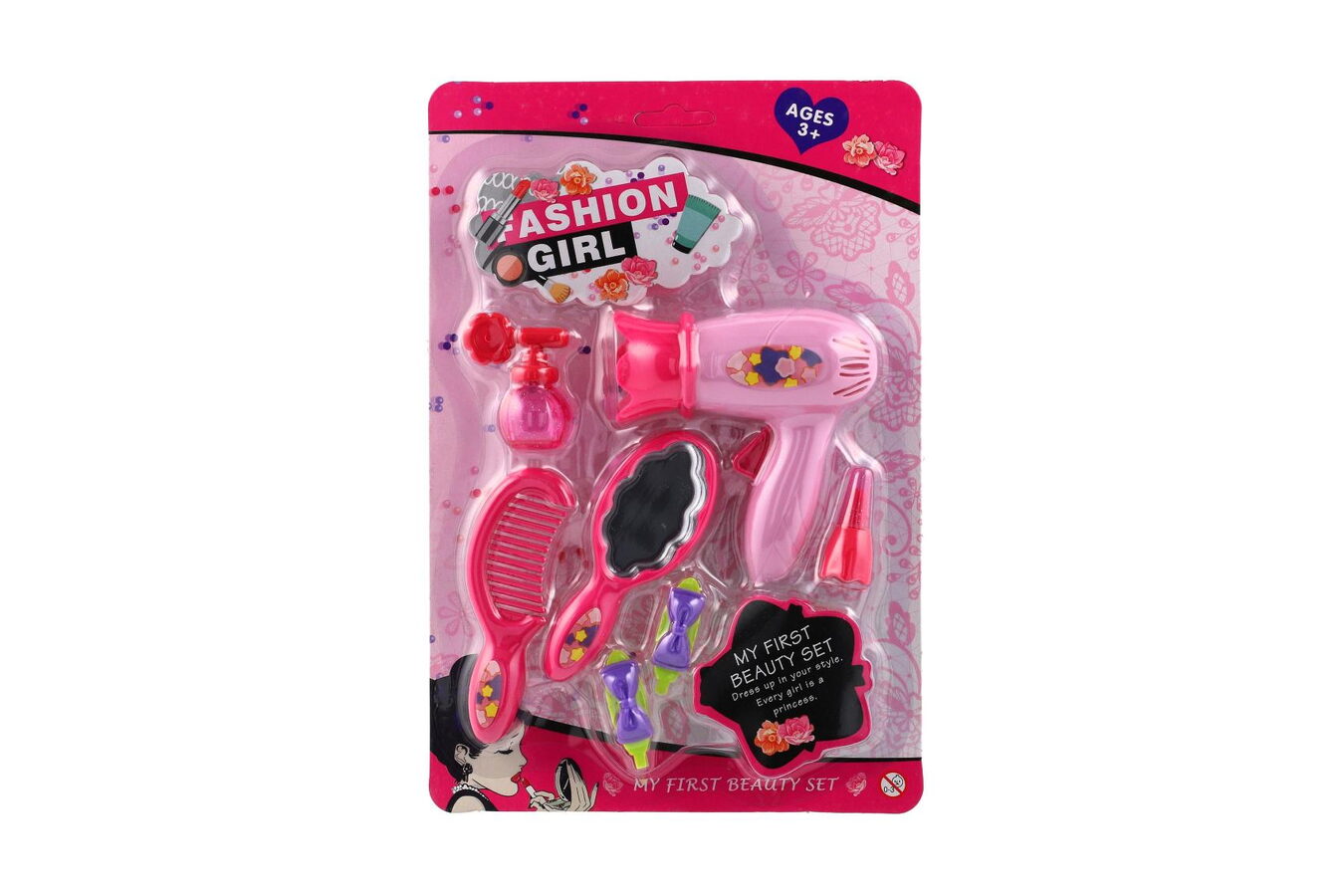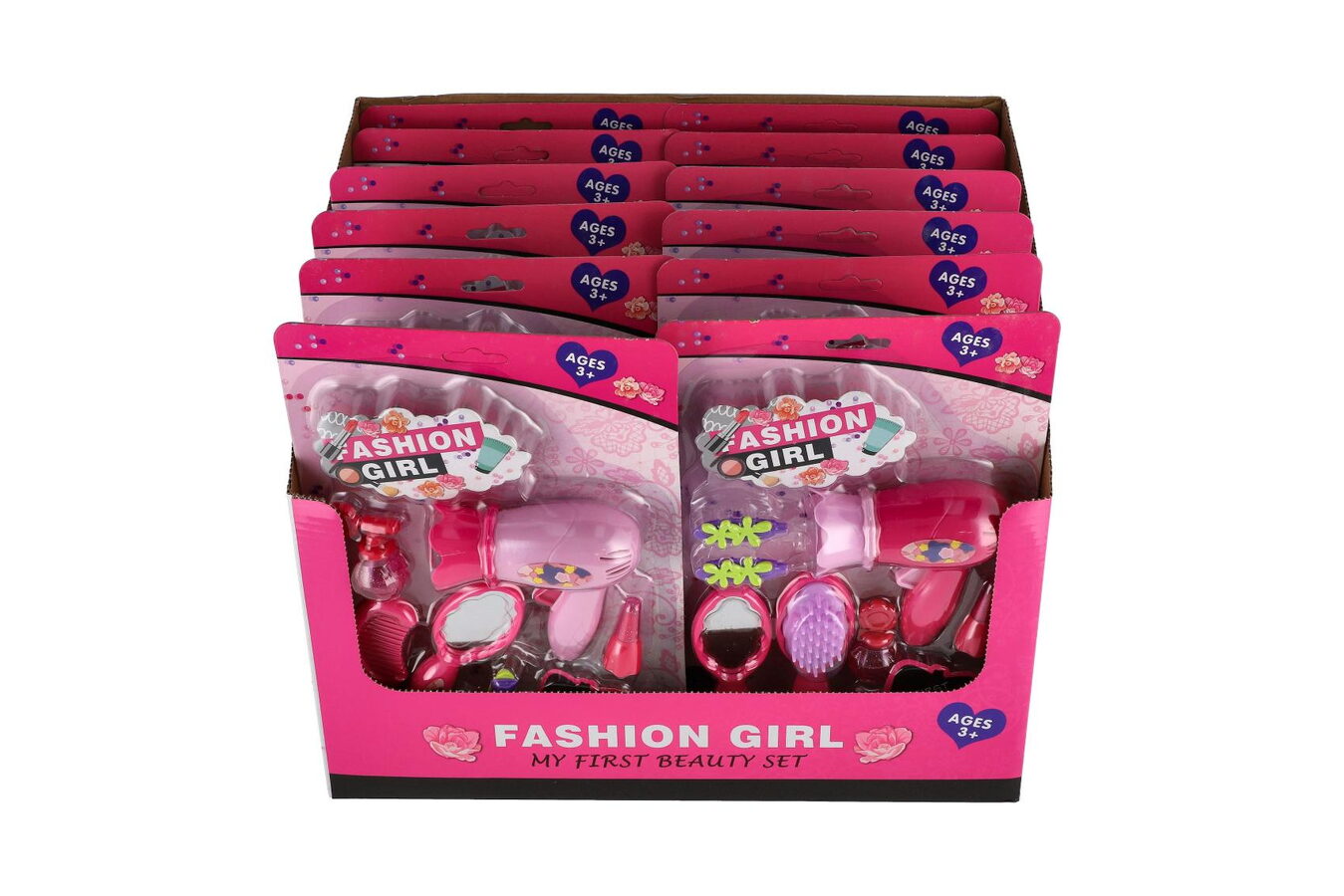 Sada krásy/Malá kadeřnice s fénem a doplňky plast 2 druhy na kartě 18,5x27,5 cm 12ks v boxu