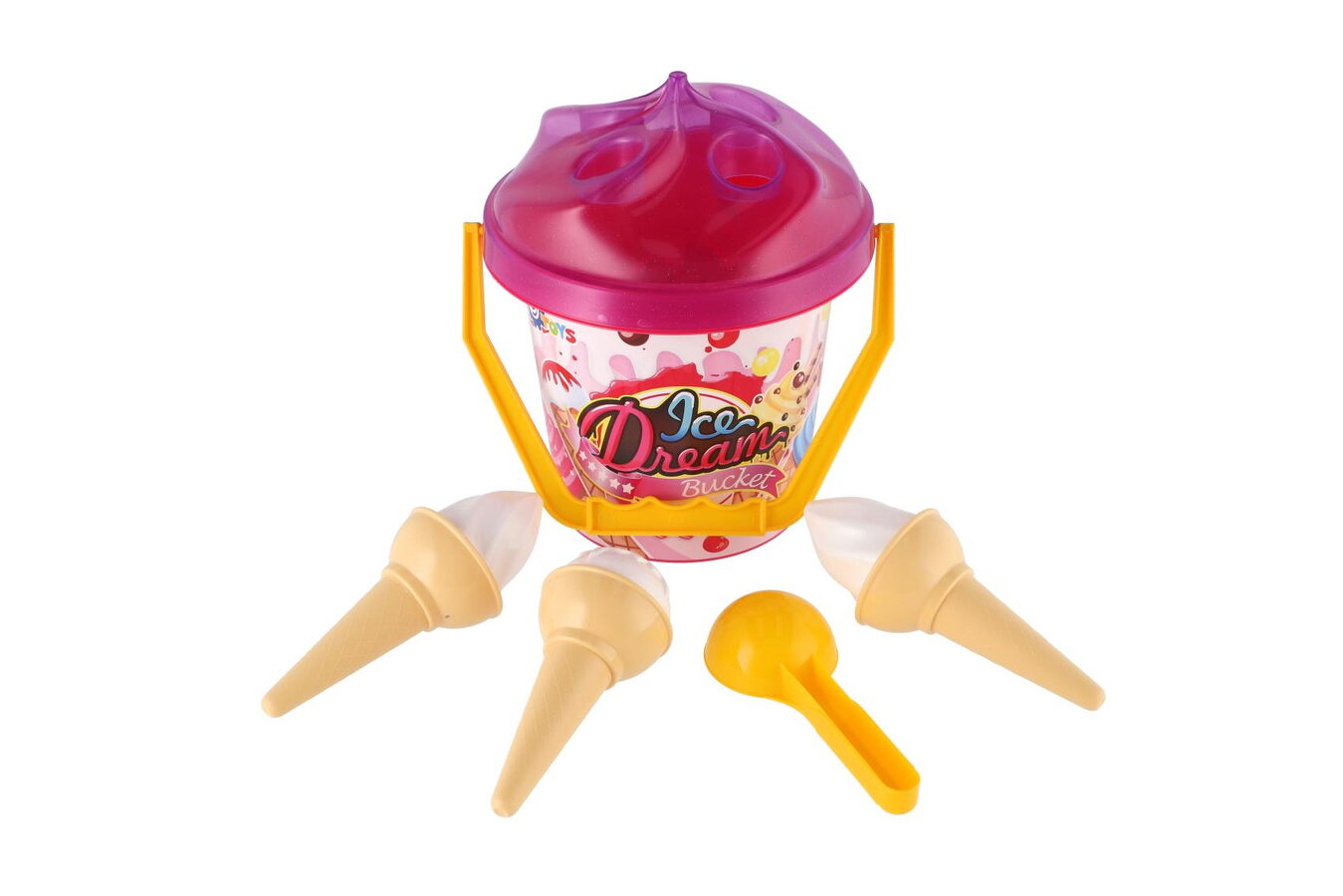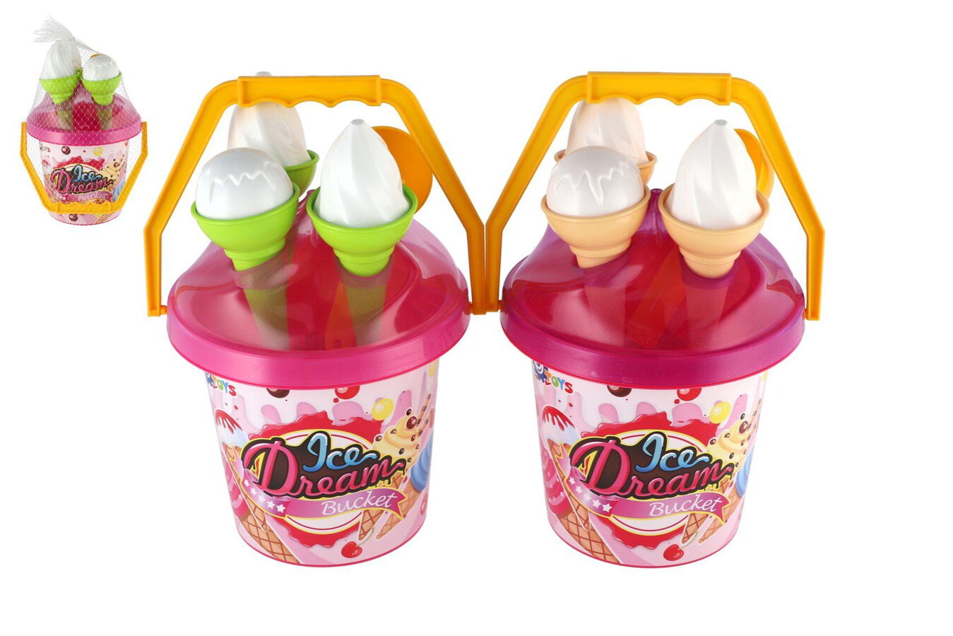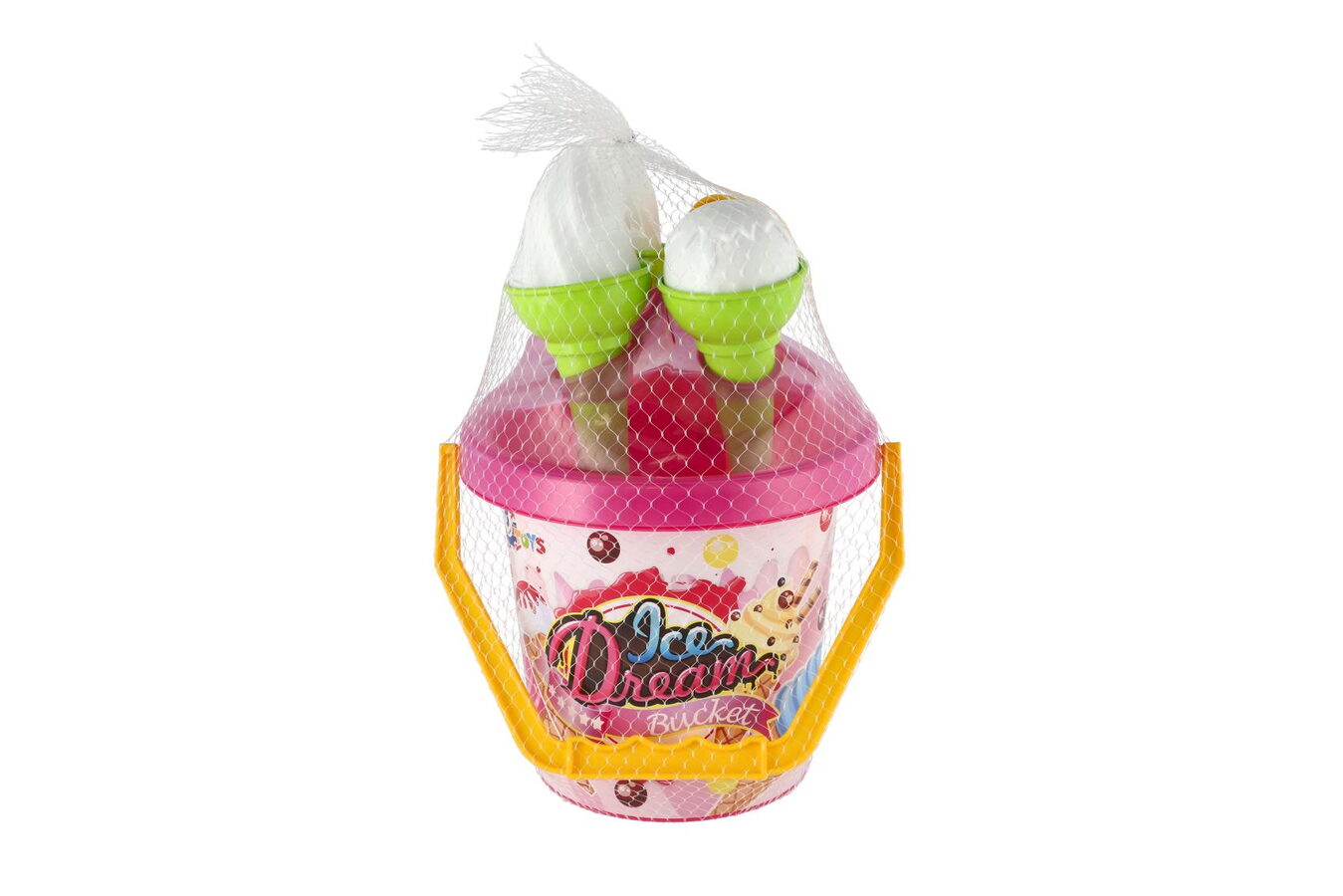 Hurá na pískoviště! Aby na něm byla dobrá zábava, nesmí tam chybět hračky na písek, které patří nepochybně mezi nejoblíbenější venkovní hračky. Sada obsahuje kyblíček, naběračku na zmrzlinu a bábovky v podobě zmrzlinových kornoutů a kopečků. Sada na písek je vyrobena z kvalitního a odolného plastu. Baleno v síťce.