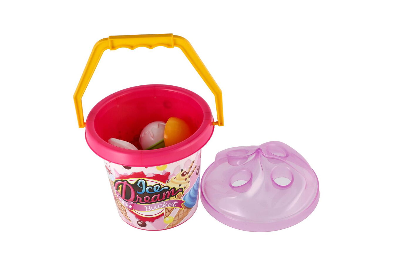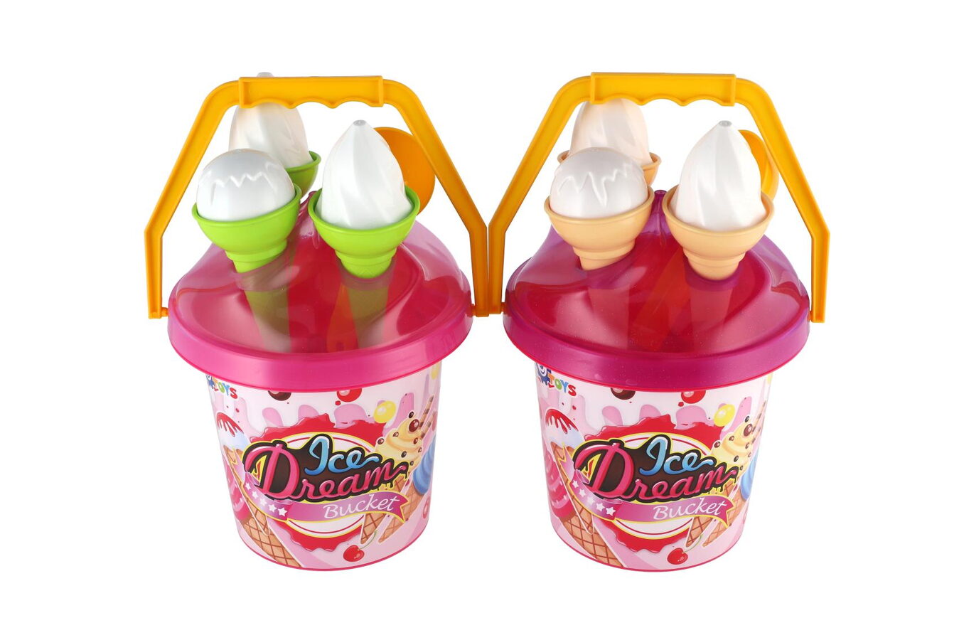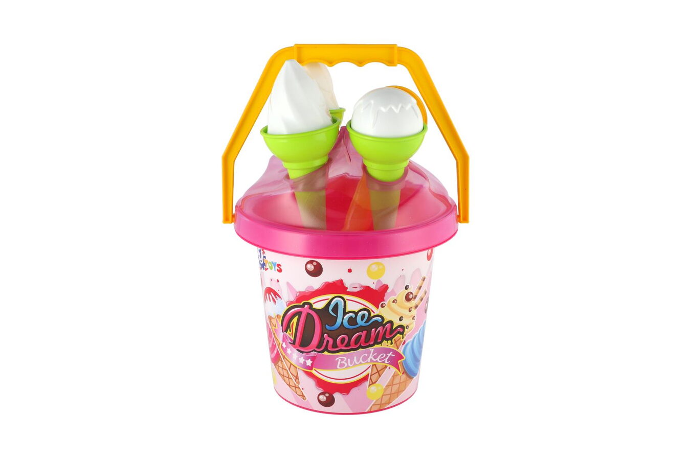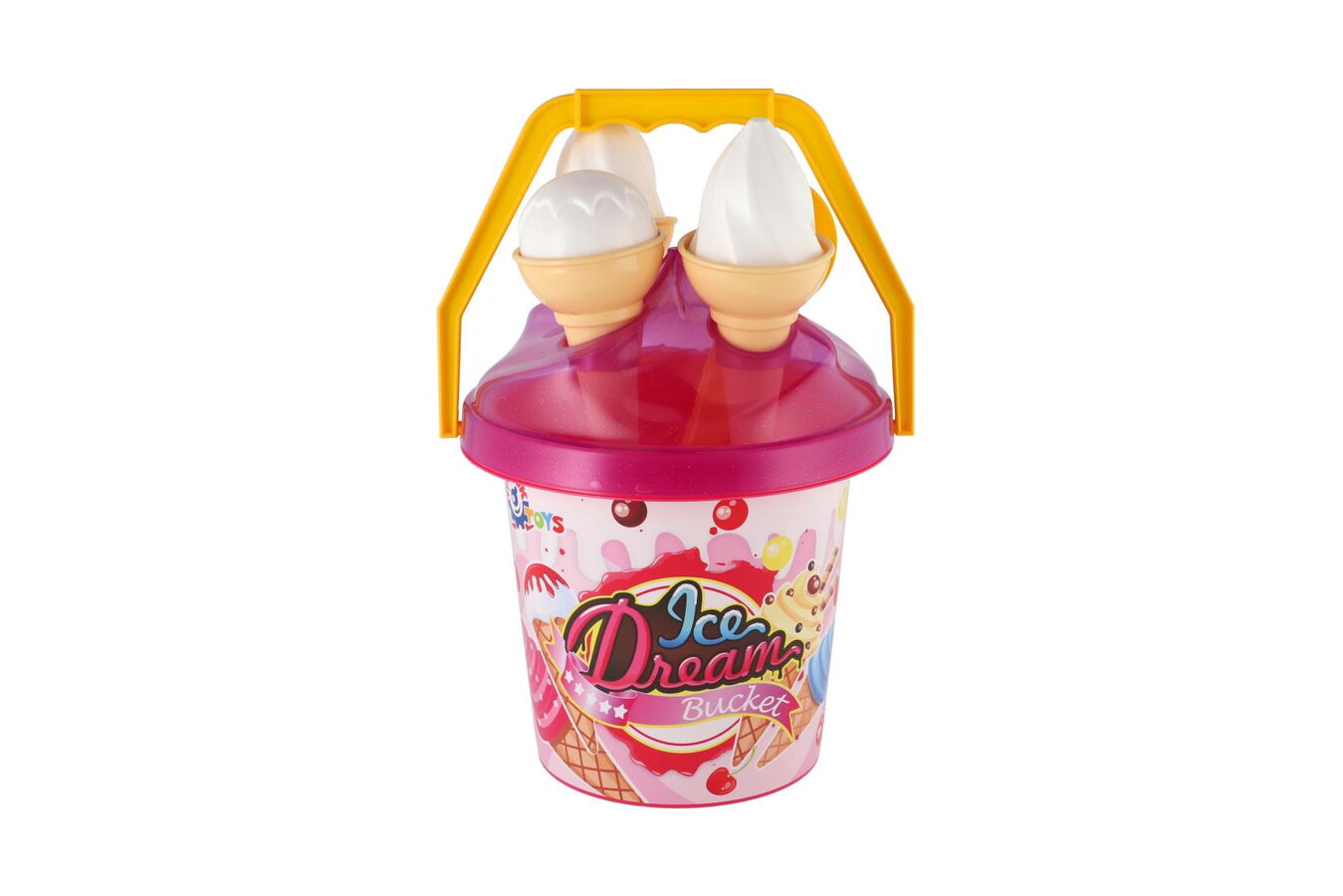 Hurá na pískoviště! Aby na něm byla dobrá zábava, nesmí tam chybět hračky na písek, které patří nepochybně mezi nejoblíbenější venkovní hračky. Sada obsahuje kyblíček, naběračku na zmrzlinu a bábovky v podobě zmrzlinových kornoutů a kopečků. Sada na písek je vyrobena z kvalitního a odolného plastu. Baleno v síťce.
