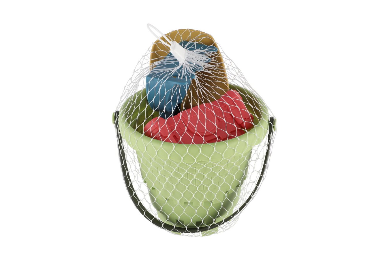 Sada na písek plast kbelík, lopatka, hrabičky, 3 formičky 3 barvy v síťce
