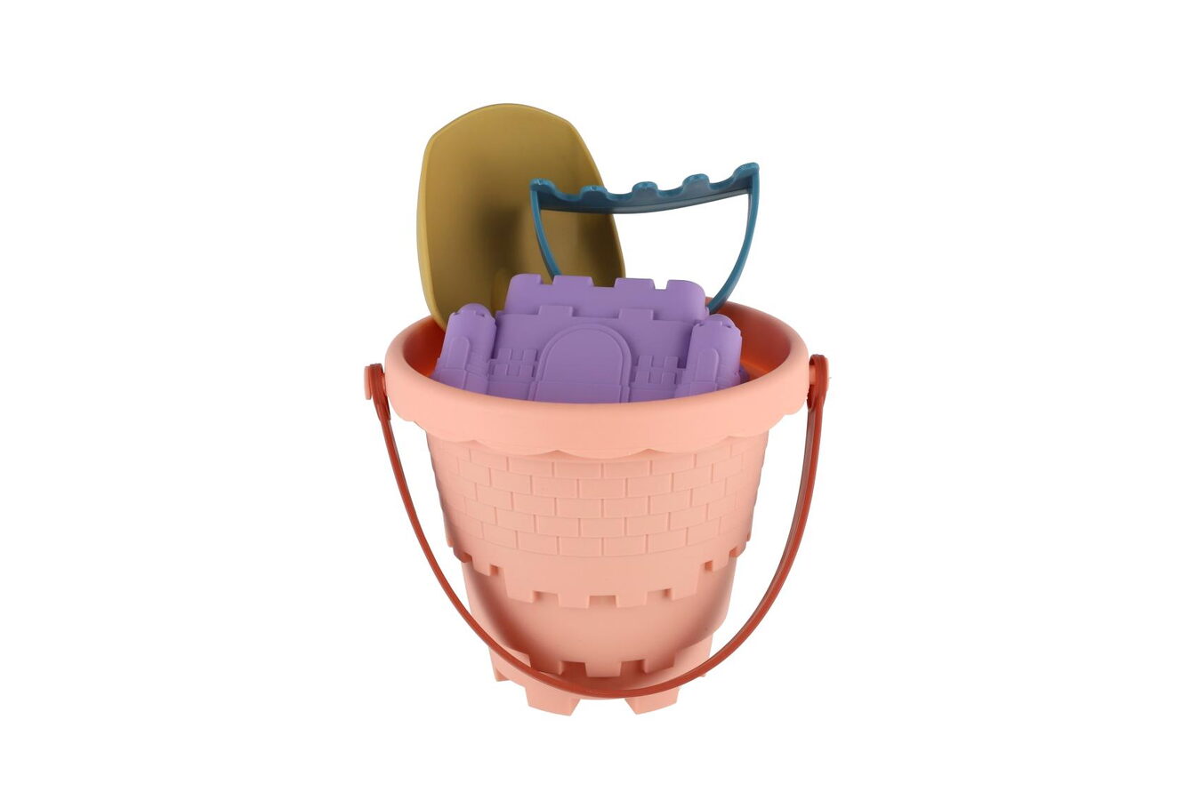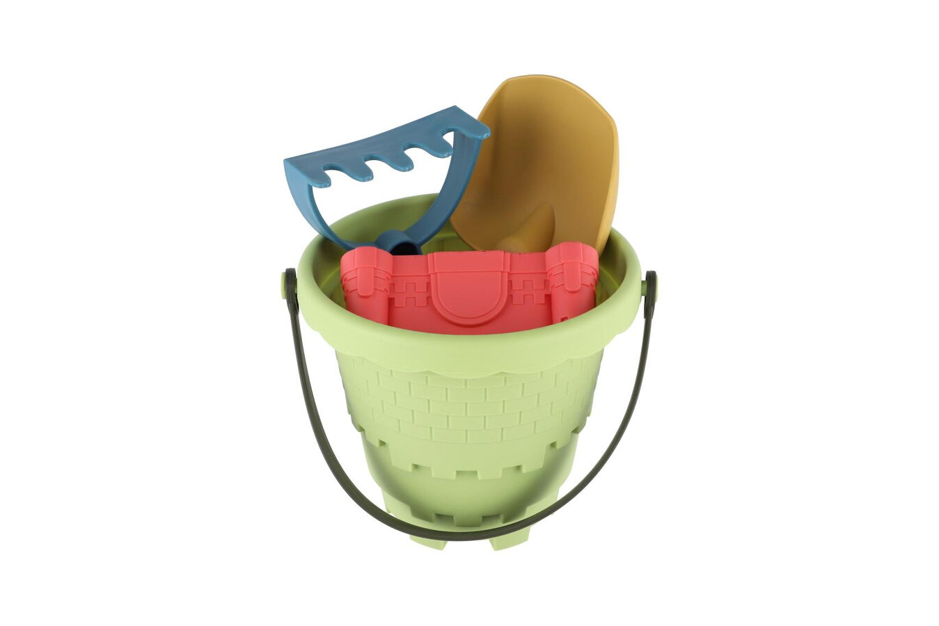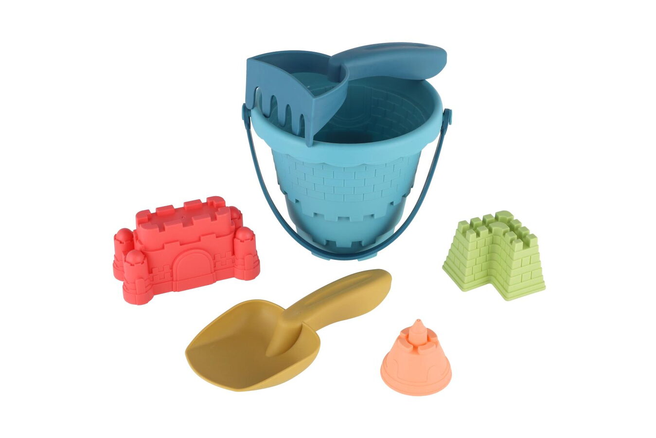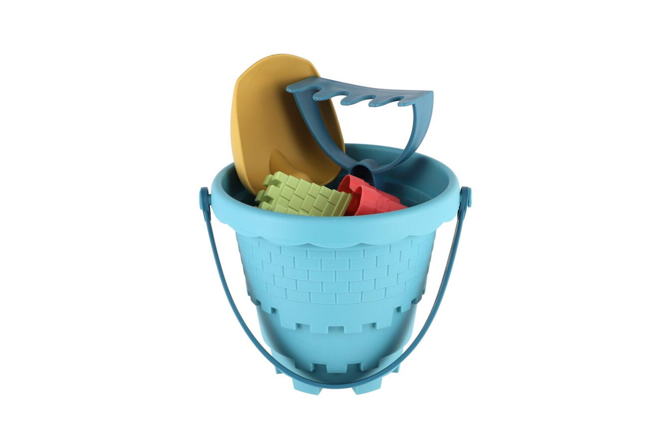 Perfektní výbava na pískoviště i pláž! Tato barevná plastová sada obsahuje kbelík, lopatku, hrabičky a 3 různé formičky pro tvoření báboviček.