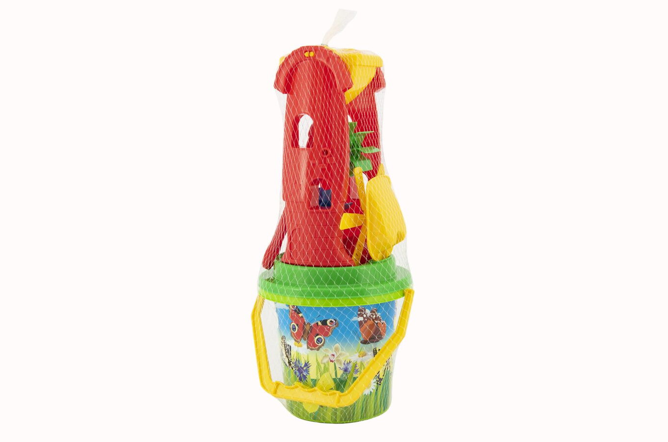 Sada na písek plast kbelík, mlýnek s doplňky 4 druhy v síťce 20x42x19cm 12m+