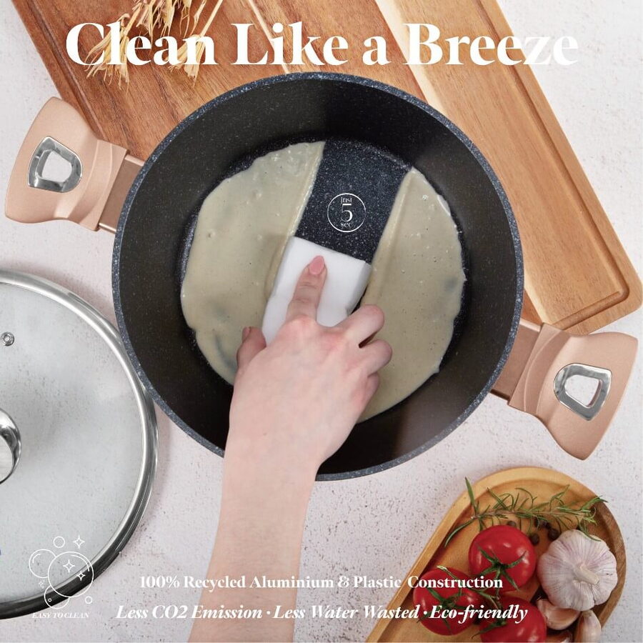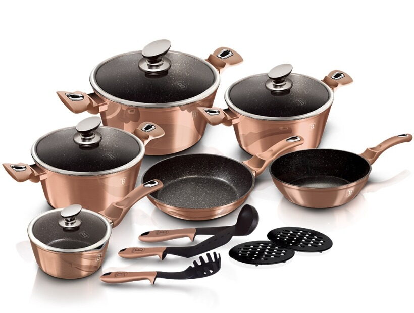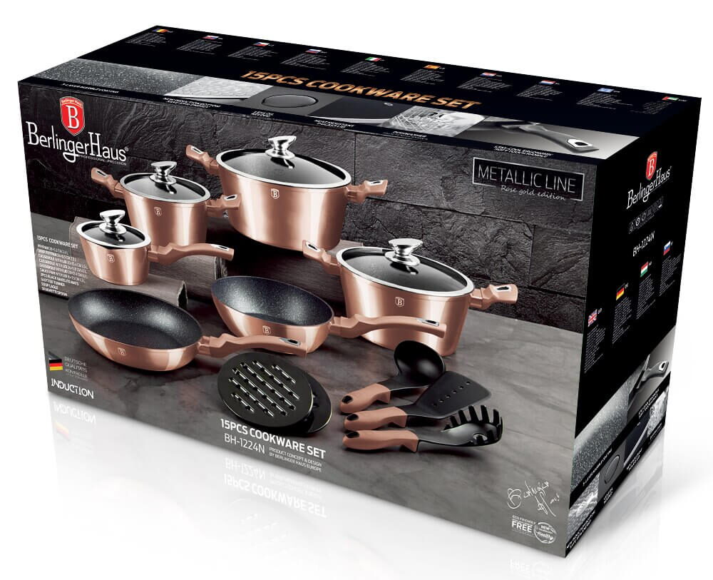 Berlingerhaus Rosegold Metallic Line je exkluzivní 15dílná sada nádobí s mramorovým povrchem, která přináší do kuchyně eleganci i praktičnost. Díky 3vrstvému mramorovému povrchu se potraviny nepřipalují, vaření je zdravější a údržba nádobí maximálně snadná.