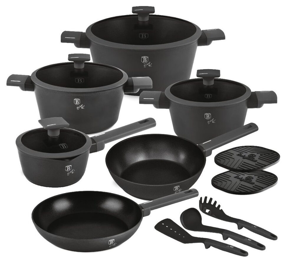 Berlingerhaus Antracit Collection je moderní 15dílná sada nádobí s titanovým povrchem, která zaujme minimalistickým stylem, odolným materiálem a praktickými funkcemi. Díky třívrstvému nepřilnavému povrchu TitanPro připravíte pokrmy zdravě, s minimem tuku a bez připalování.