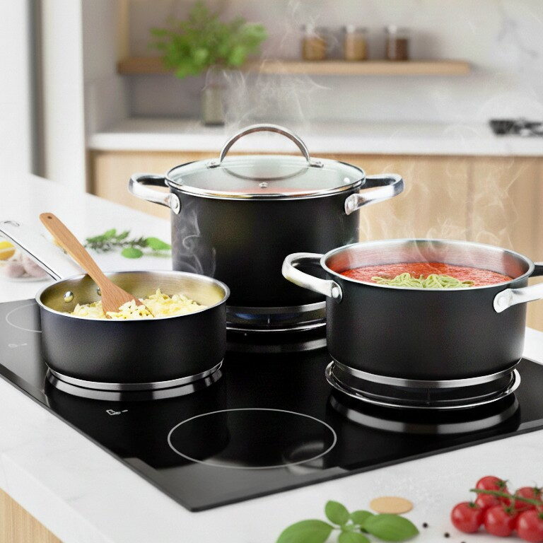 •Nádobí skládající se ze 2 kastrolů, 2 poklic a rendlíku: kastrol 16 cm s objemem 1,3L + kastrol 20 cm s objemem 2,8L a kastrol 24 cm s objemem 4,5L.•Vyrobeno ze silné nerezová ocel pro rychlou distribuci tepla. Pevný a odolný materiál.•Toto nádobí obsahuje 2 poklice z čirého skla pro každý kastrol a má otvor pro výstup páry. •Vhodné pro všechny typy sporáků: indukční, halogenové, elektrické, plynové a sklokeramické.•Doporučujeme je mýt ručně.Velmi kompletní a moderní nádobí. Skládá se z 16 cm kastrolu, 20 cm kastrolu a 24 cm kastrolu. Rychlá distribuce tepla díky nerezové oceli vám umožní získat to nejlepší nádobí a ušetřit čas. Součástí jsou 2 průhledné skleněné poklice, pomocí kterých můžete bezpečně ovládat okamžité vaření. Toto nádherné nádobí si můžete vychutnat v každém z různých typů sporáků, které existují na trhu: indukční, halogenové, elektrické, plynové a sklokeramické. Doporučuje se ruční mytí.