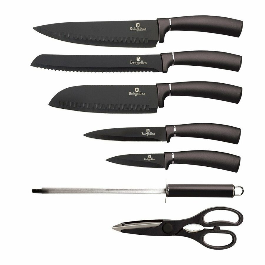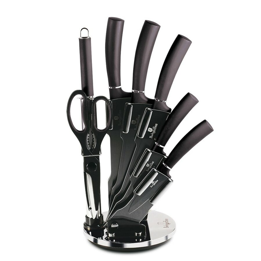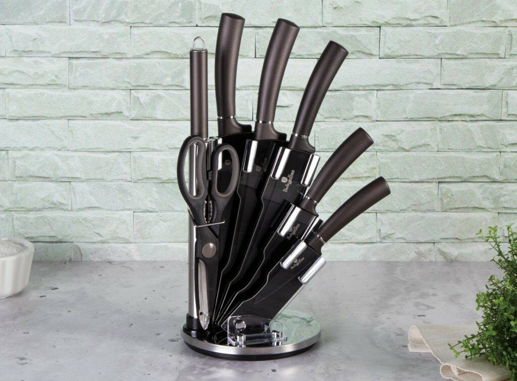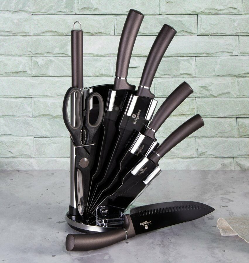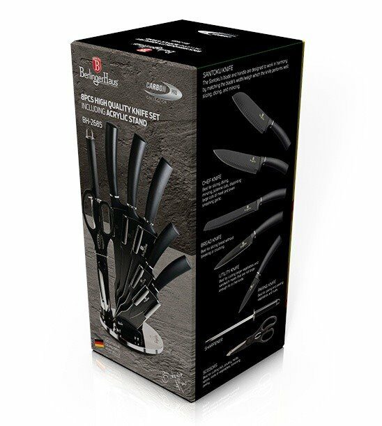 Sada nožů v otočném stojanu z nové kolekce Carbon PRO Line. Ty nejpoužívanější kuchyňské nože, nůžky a také ocílka v přehledném stojanu, který je navíc dokonalým designovým doplňkem do kuchyně. Tvrdá nerezavějící ocel zajistí dlouhou životnost nožů. Konkrétně je celá sada nožů vyrobena z nerezové oceli s antibakteriálním nepřilnavým povrchem Diamond.