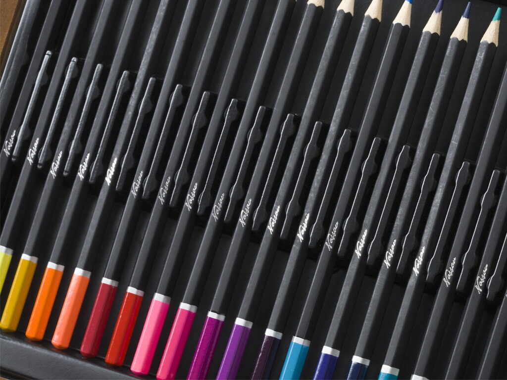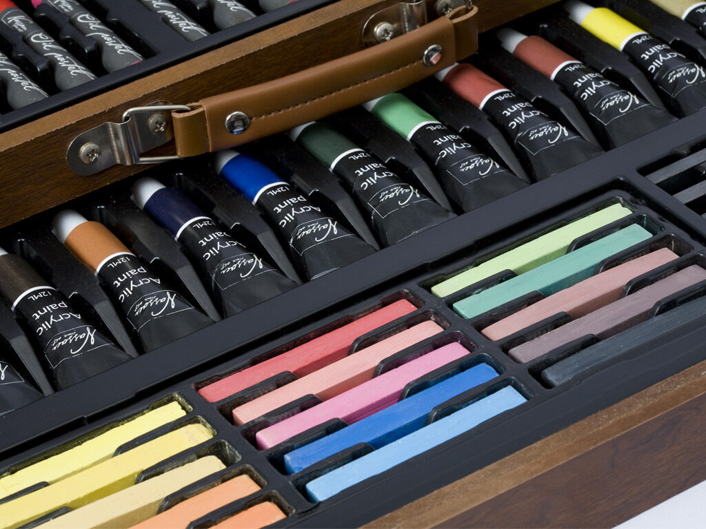 Sada pro malíře v dřevěném kufříku – dřevěný rozkládací kufřík obsahuje vše pro malíře – barevé křídy, pastelky, barvy, ořezávátko, gumu, štětce atd. celkem 112 ks.